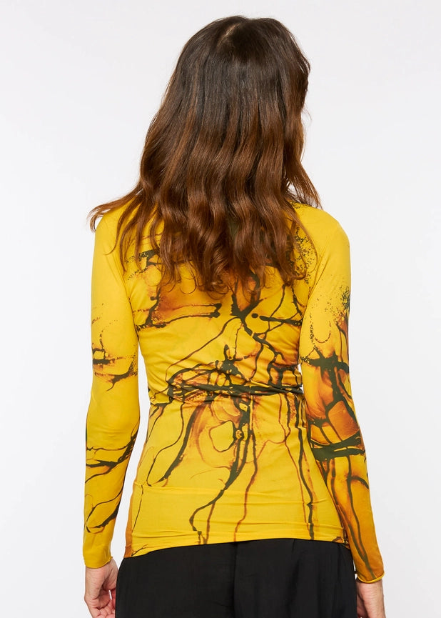 The Amber Raw Edge Second Skin Top offers a comfortable and stylish addition to your wardrobe. Made from ultra soft, semi sheer fabric, this long sleeve top features raw cut edges and a higher neckline for added interest. The unique Amber print adds a touch of personality to any outfit. One size fits sizes 0-12, making it a versatile and accessible option. Simply wash with cold water and hang to dry for easy care. Crafted with 92% nylon and 8% spandex, this base top was designed and printed in the USA for exceptional quality.