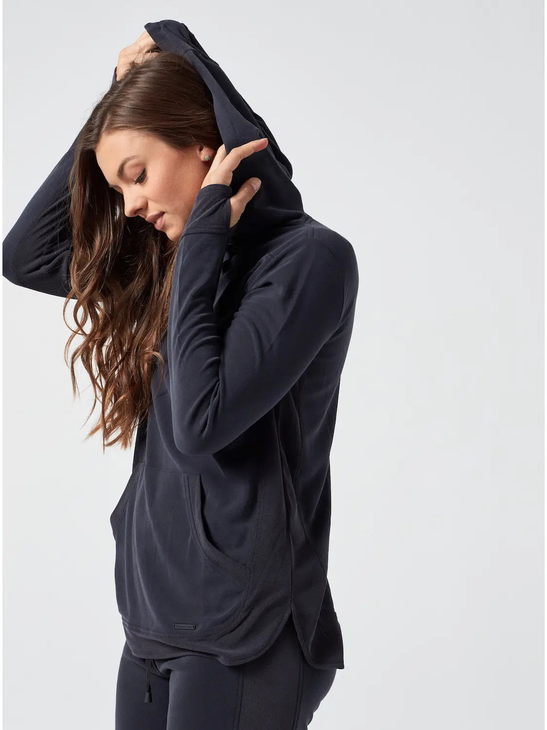 The Amour Hoodie combines sophisticated design with exceptional comfort. Crafted from a premium blend of sandwash modal double jersey and silk satin accents, it offers a soft, breathable feel with subtle stretch. Features like a functional hood drawcord and thumbholes enhance fit and practicality, while the vintage wash adds timeless character. With a comfortable 27" center back length, this hoodie is perfect for layering or standalone wear, delivering both style and performance for discerning wardrobes.