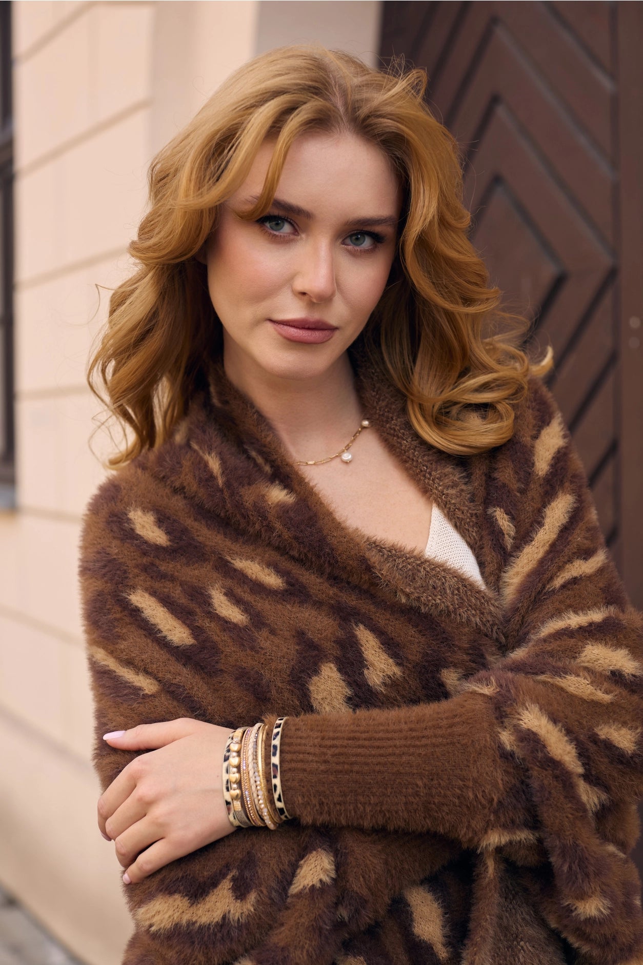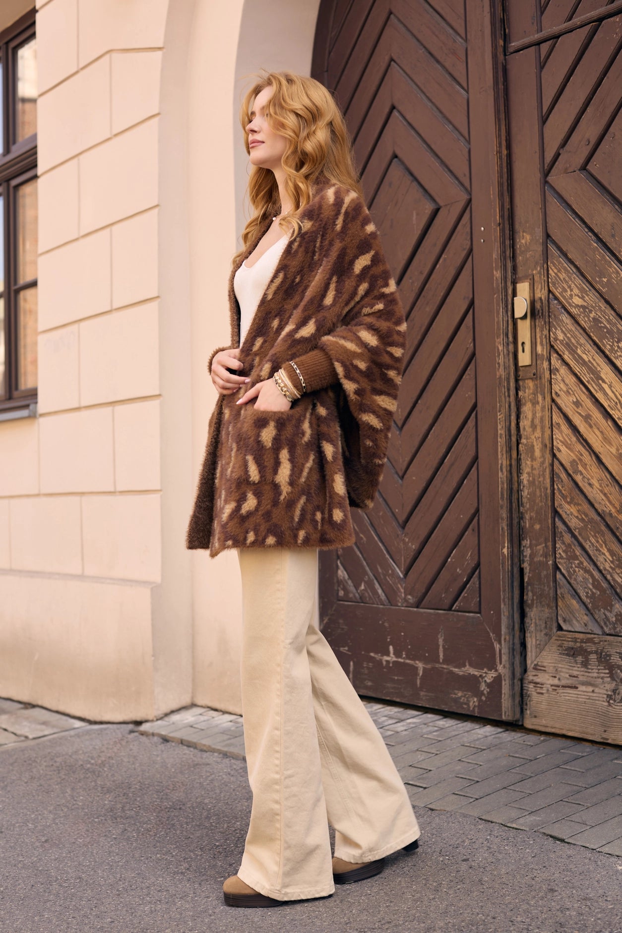 The Animal Print Eyelash Knit Cardigan offers a perfect blend of plush texture and daring design. Crafted from a fine eyelash knit, it drapes gracefully and features a distinctive animal print that radiates sophisticated charm. Perfect for staying warm with elegance, this cardigan elevates everyday looks or adds a stylish, unexpected twist to more formal attire. Imported, made from 100% Nylon.