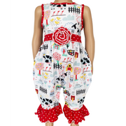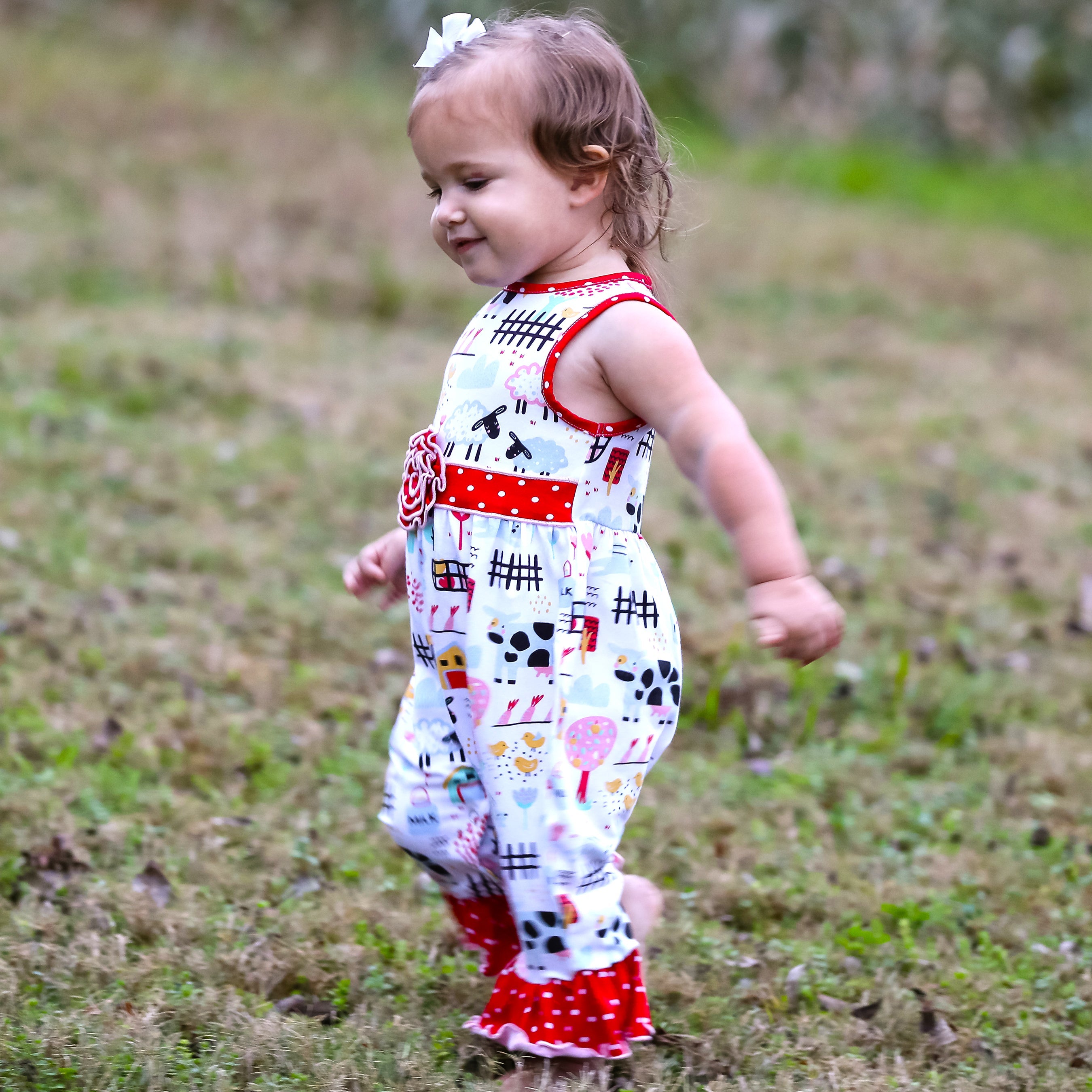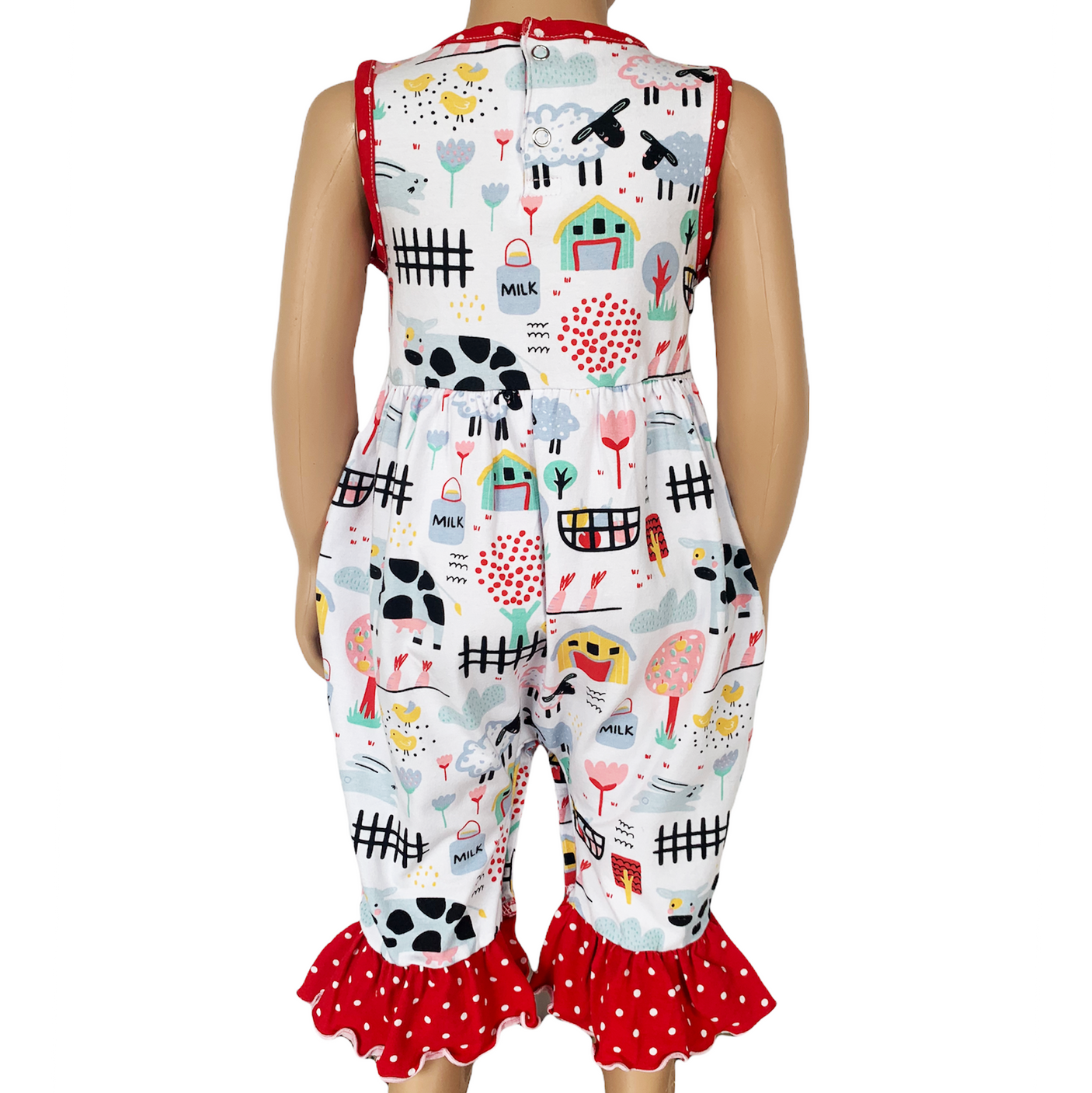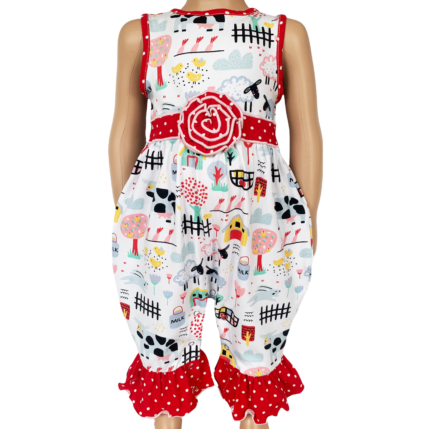 AnnLoren Fun Farm Animals Baby Girls Romper. Red Polka Dot trim on neckline, rose and pant ruffles. Snaps at inseam for easy changing and dressing. The 95% high quality Egyptian cotton and 5% stretchy lycra fabric is SUPER soft and comfortable. Premium dye's ensure that your outfit won't fade or run. Machine Washable.