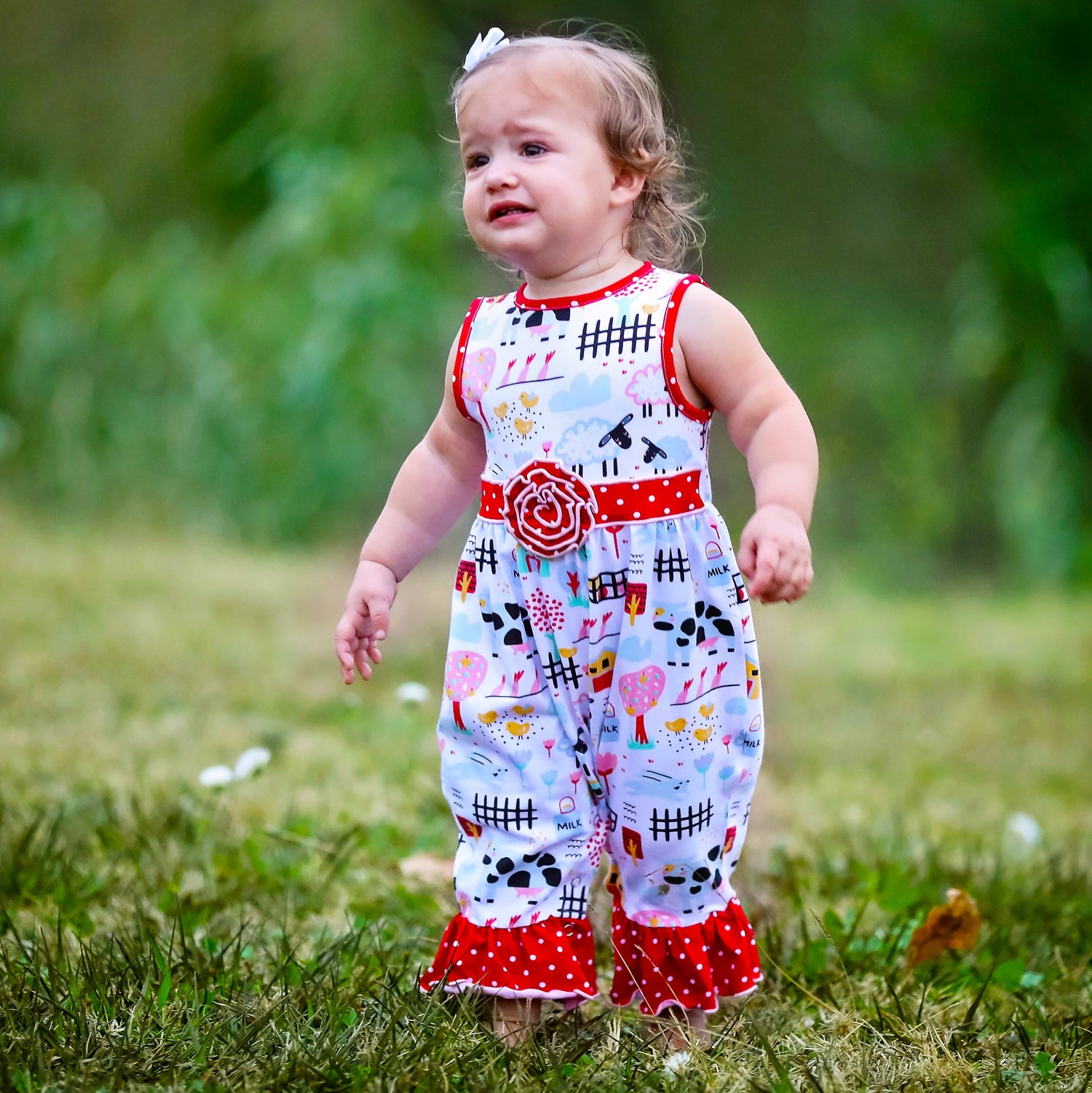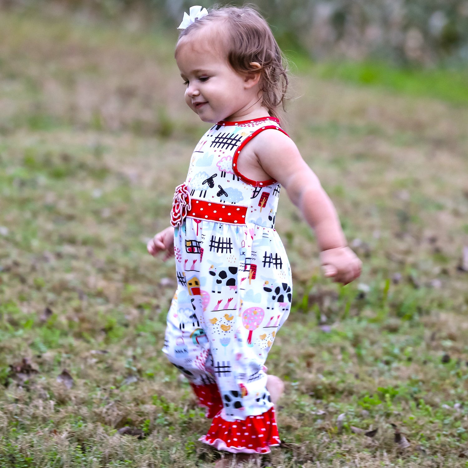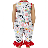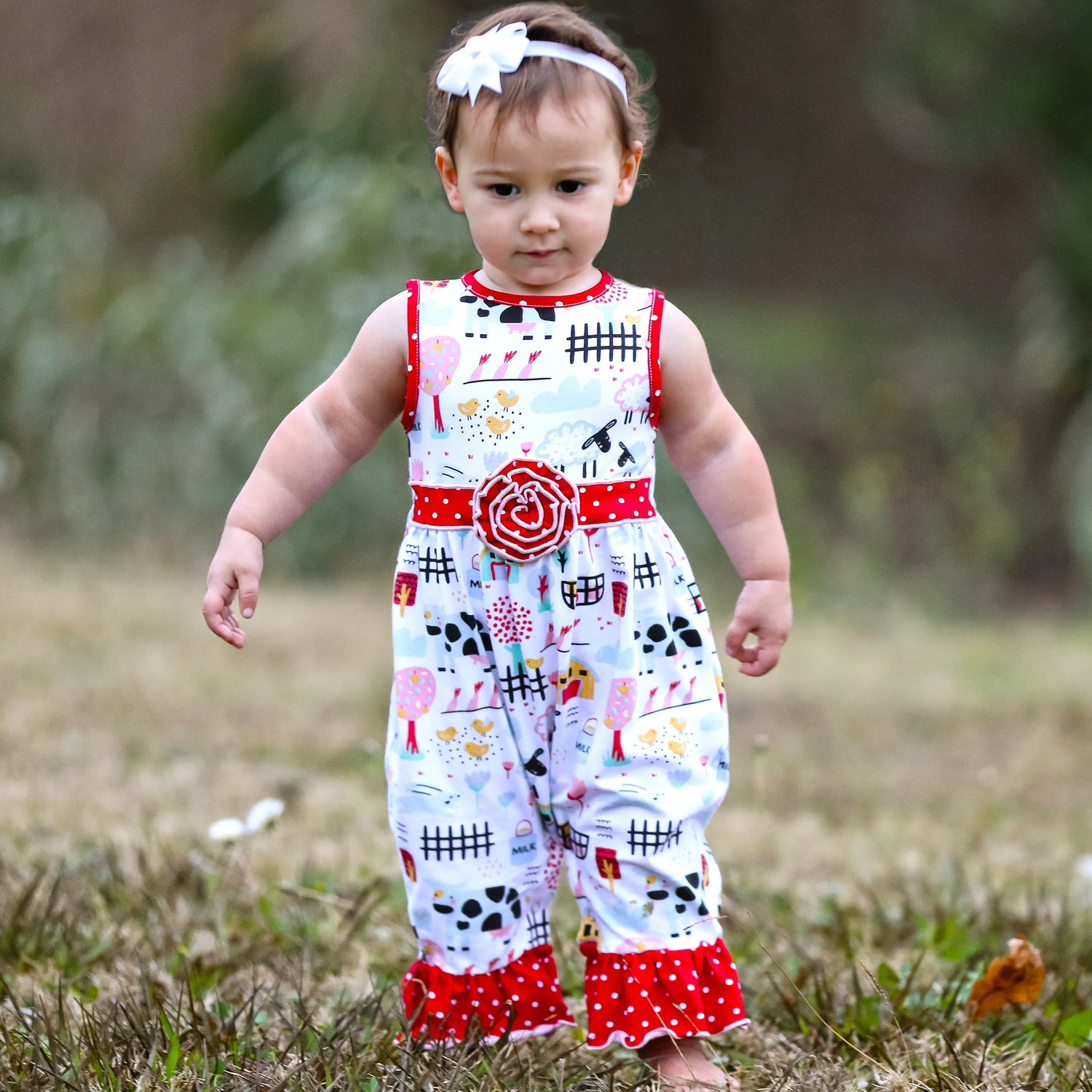 AnnLoren Fun Farm Animals Baby Girls Romper. Red Polka Dot trim on neckline, rose and pant ruffles. Snaps at inseam for easy changing and dressing. The 95% high quality Egyptian cotton and 5% stretchy lycra fabric is SUPER soft and comfortable. Premium dye's ensure that your outfit won't fade or run. Machine Washable.