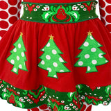 AnnLoren Original Red Jersey Knit Long Sleeve Cotton Tunic finished with Christmas Tree appliques embroidered on attached skirt. Christmas Damask fabric designed exclusively for AnnLoren. Tie around belt at waist. Leggings with an elastic waistband for a comfortable fit. Made with 95% Cotton/5% Spandex stretch. and Machine Washable.