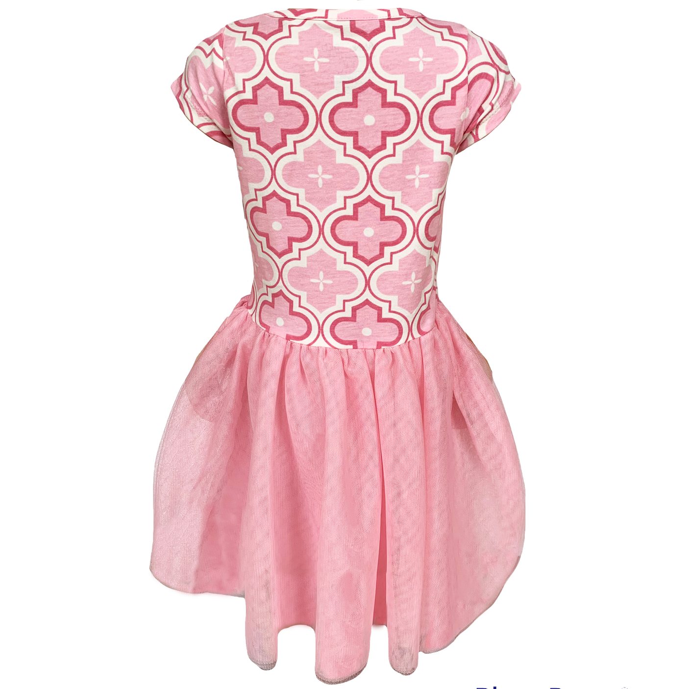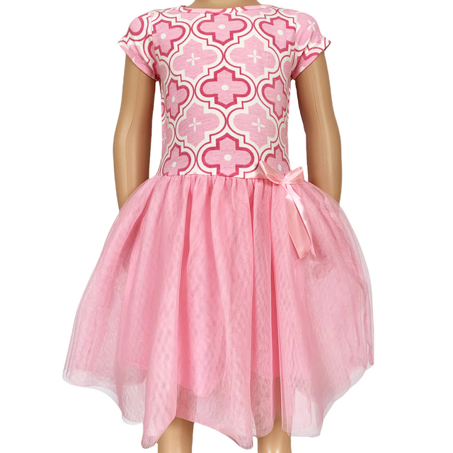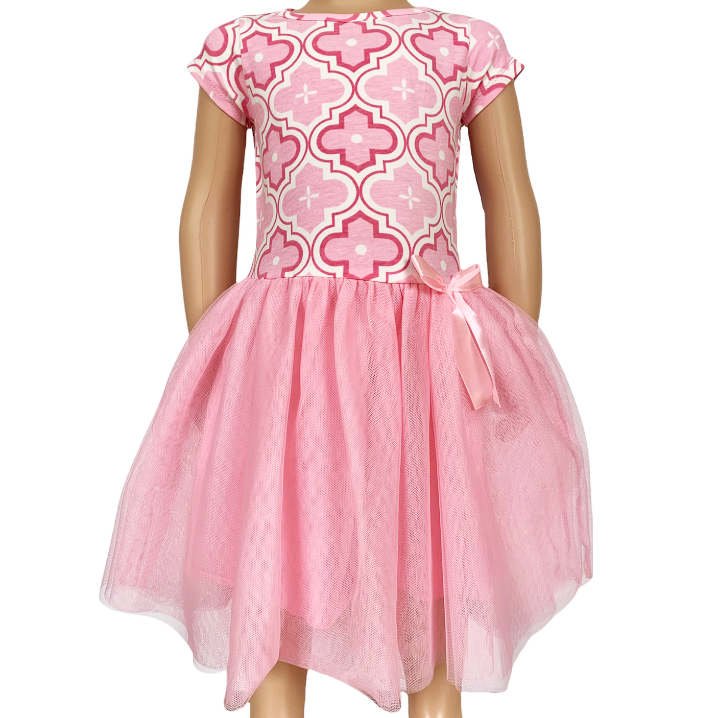 AnnLoren Spring Pink Tulle Party Dress. Short cap sleeve cotton arabesque knit top of dress. Drop waist Full Pink Tulle Skirt attached dress. Pink Satin Bow. Premium dye's ensure that your outfit won't fade or run. Machine Washable. Hang Dry.