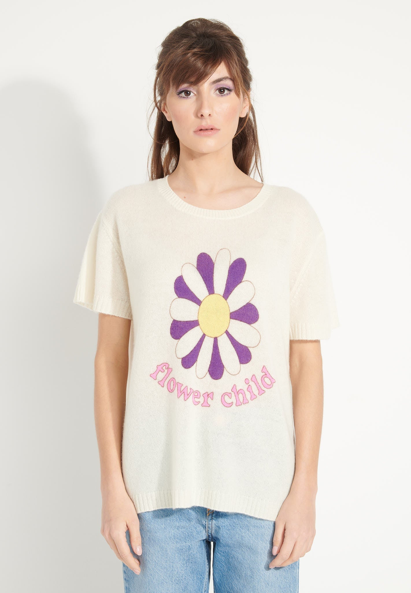 AVA 8 T shirt en cachemire déjaugé col rond manches courtes avec imprimé "FLOWER CHILD" blanc écru