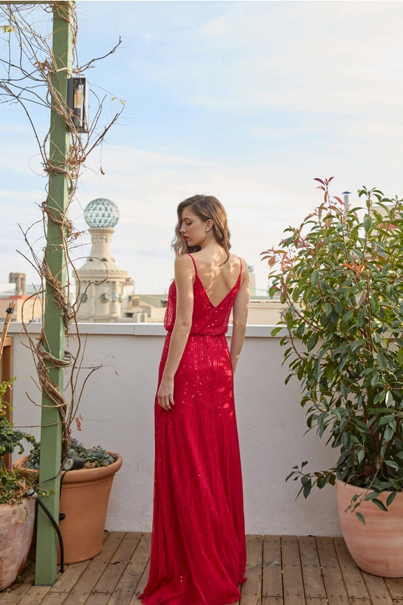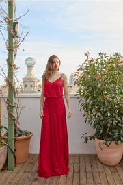 This long Aymara Maxi Dress is available in two stunning colors, Red and Teal. Made with delicate tulle and adorned with hand embroidered rhinestones, this dress is perfect for any formal occasion. Elevate your style and make a statement with this elegant and sophisticated dress.