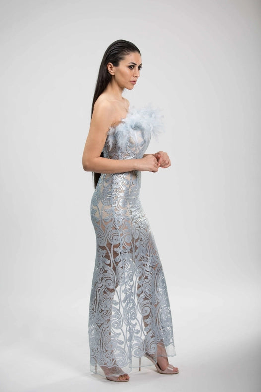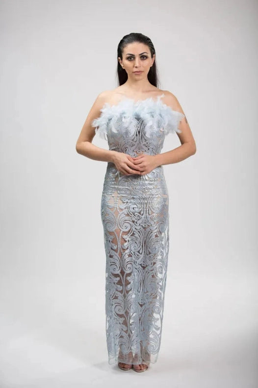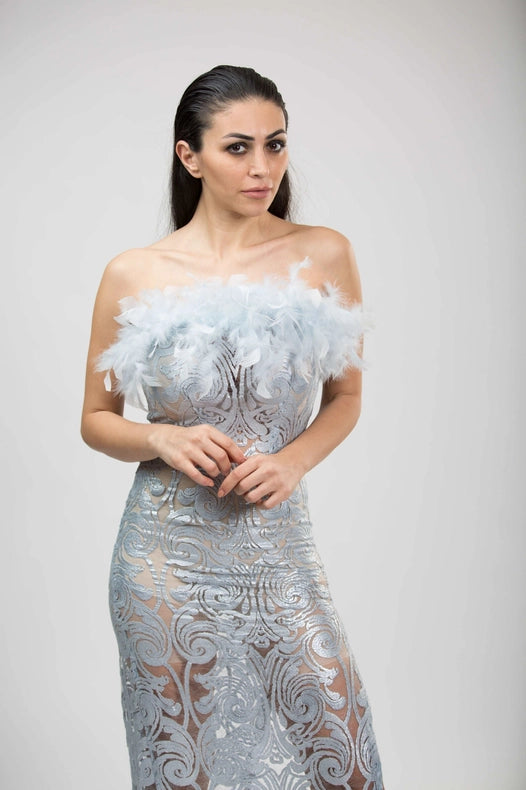 Elevate your style with our Baby Blue Lace Evening Dress. Made with exquisite lace and feather detailing, it's available with or without lining and designed to fit EU size 34/36. Handcrafted in Switzerland, this dress exudes elegance and should be dry cleaned for optimal care. Perfect for any special occasion, feel confident and beautiful in this stunning baby blue dress.