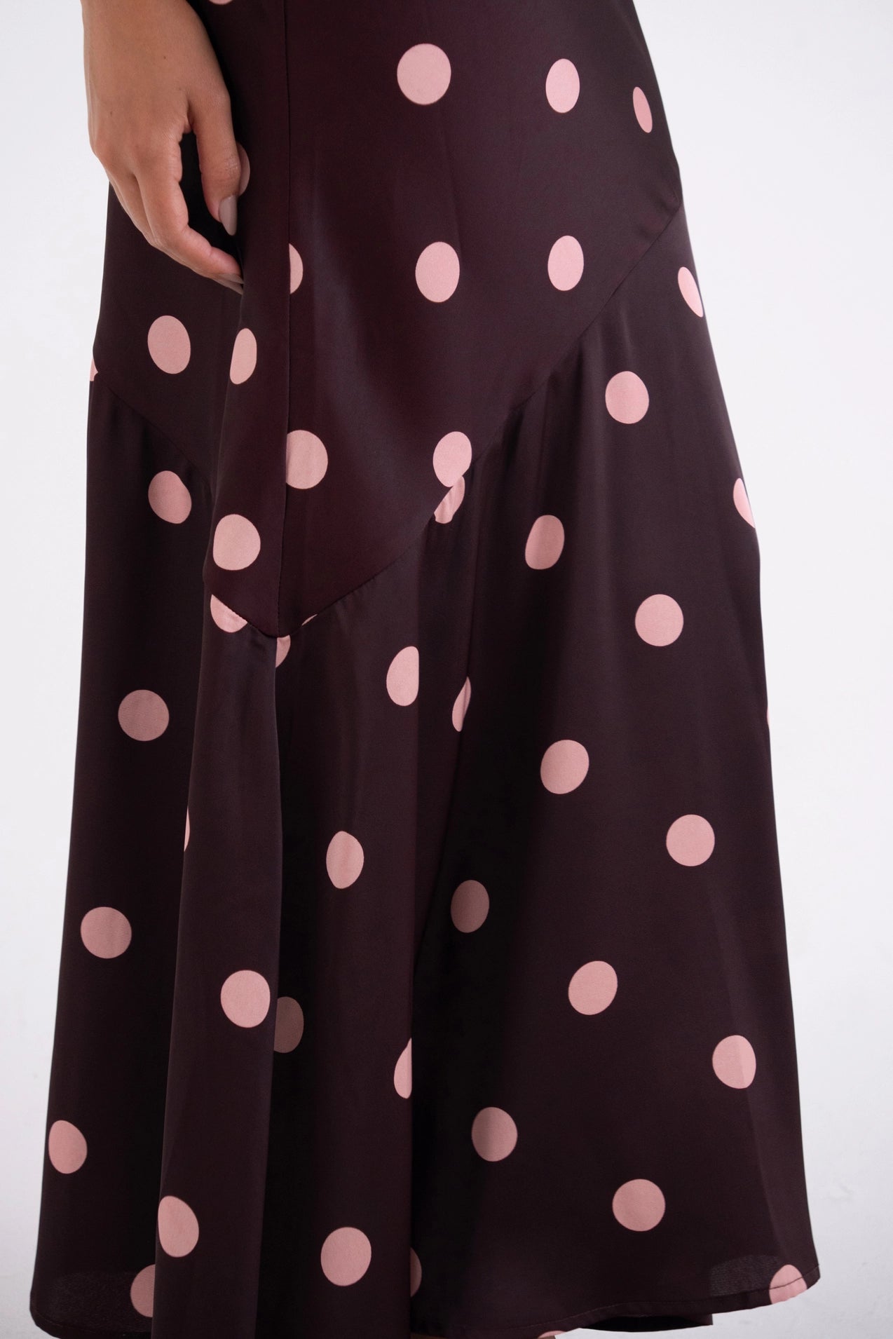 Elevate your seasonal wardrobe with this refined halterneck maxi dress, designed for those who appreciate understated elegance. The luxurious satin fabric drapes beautifully in a warm burgundy hue adorned with delicate blush polka dots, while the scarf-tie neckline and gracefully asymmetrical cut create an effortlessly chic silhouette. A striking open back adds intrigue, while the bias-cut construction ensures a fluid, flattering flow from waist to hem. Ideal for autumn galas and winter soirées alike.
