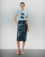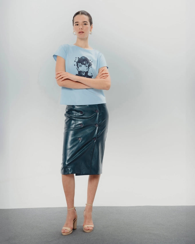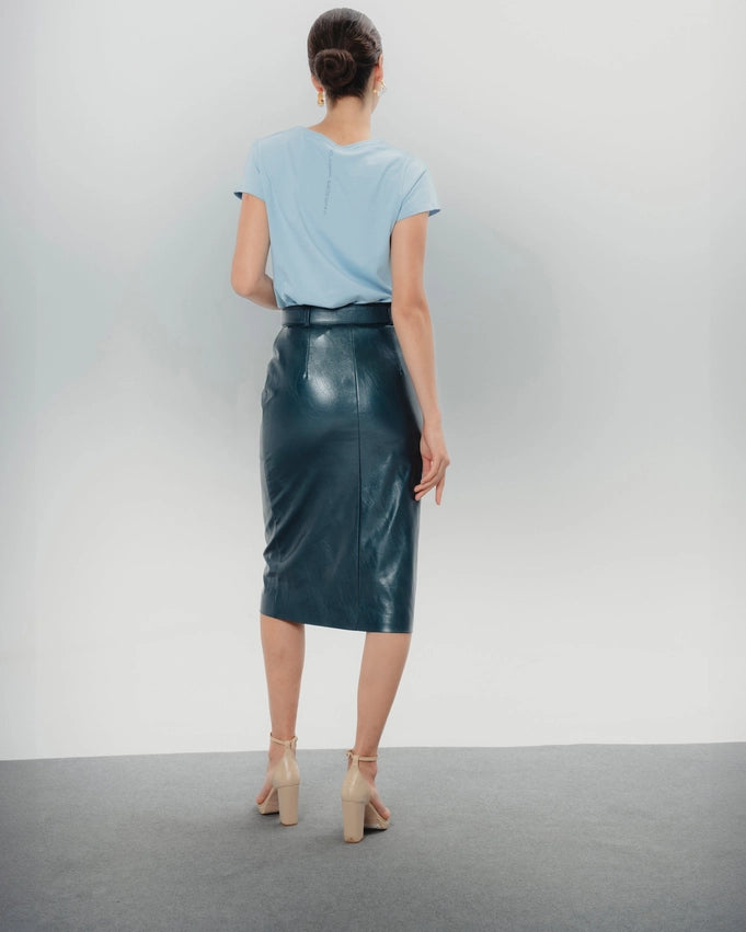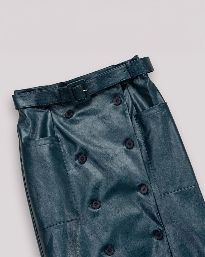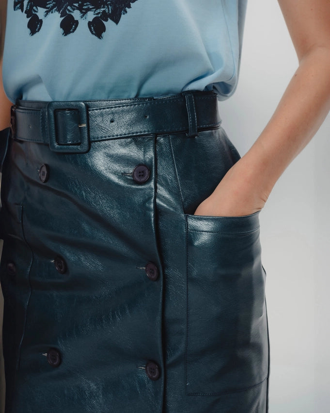 Elevate your autumn wardrobe with the Bella Leather-Effect Midi Skirt. Crafted in Spain, this semi-leather skirt boasts a straight silhouette with cross buttons and a waistband that is made of the same material. With its vibrant blue color, this skirt exudes strength and elegance, making it a must-have piece for the season.