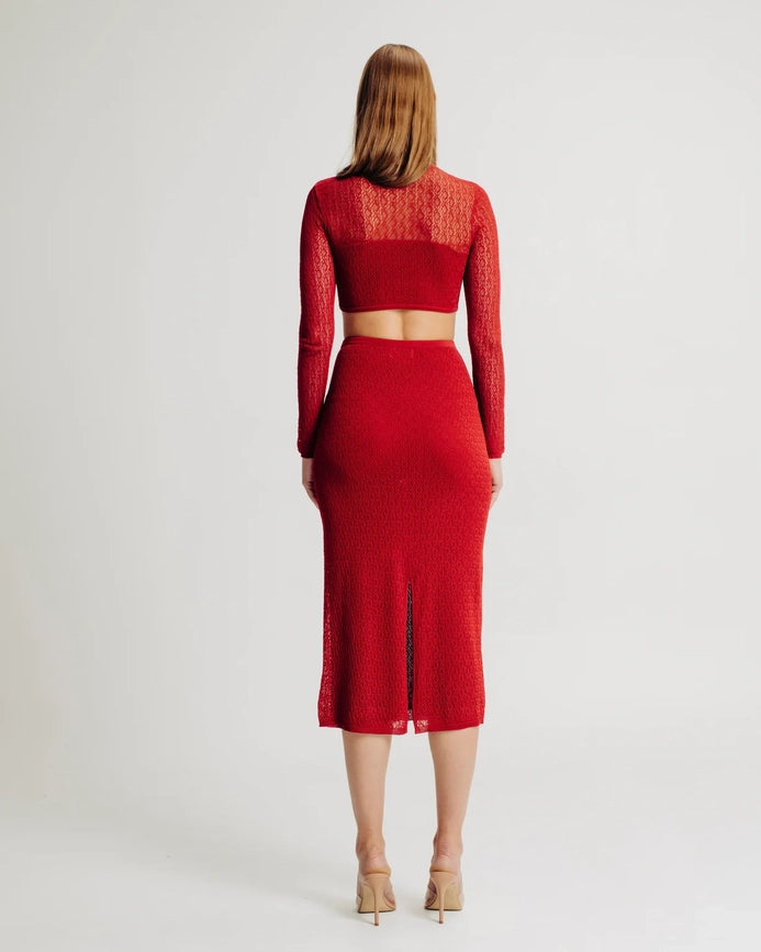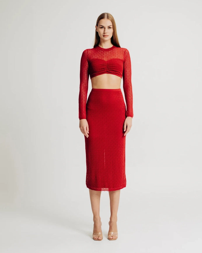 Crafted from delicate pointelle lace knit, the Beverly Top offers both texture and style. With ruching detail at the front and a fully lined body, it provides a flattering silhouette and comfortable fit. The sheer yoke and sleeves add a touch of sophistication. Complete the look with the Beverly Skirt.
