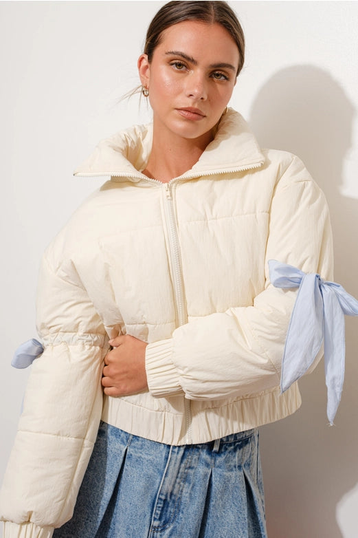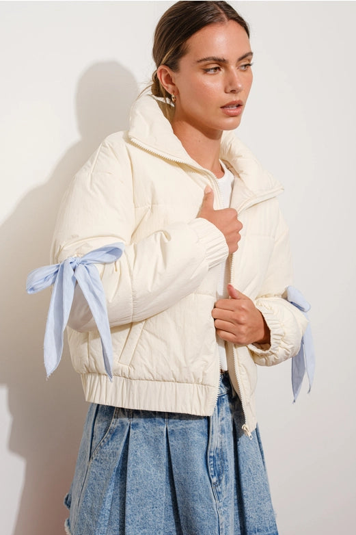 Introducing our Bow Puffer Jacket, the perfect addition to your winter wardrobe. Stay warm and stylish with this cropped puffer jacket featuring a unique bow detail at the sleeve. The front zip up closure and two pockets provide both functionality and fashion. Bundle up in style this season with our Bow Puffer Jacket.
