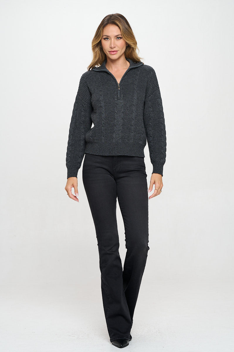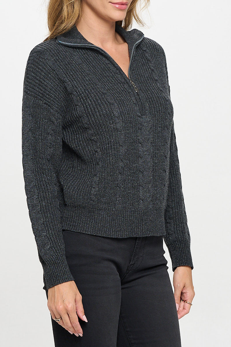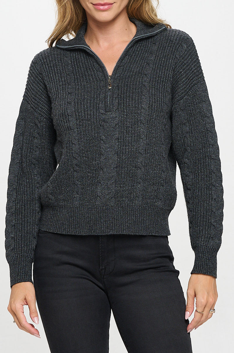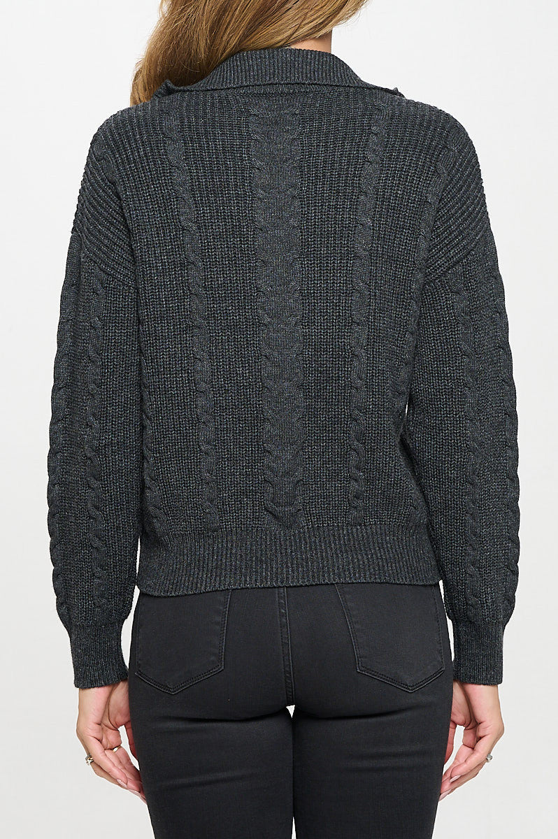 Braided Knit Detail Long Sleeve Zip Up Sweater