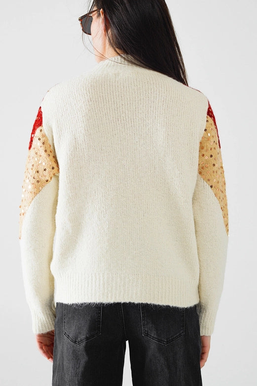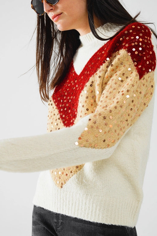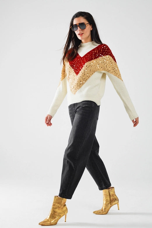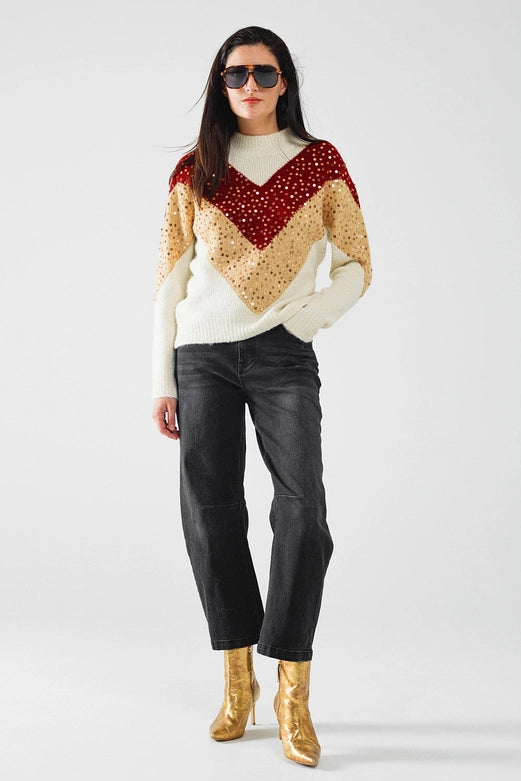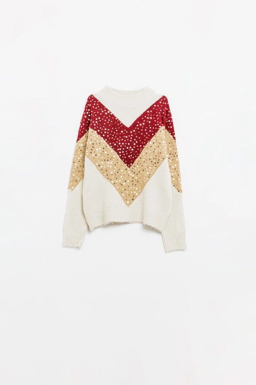 Burgundy and Beige Color Block Knit Sweater with Sequin Embellishment