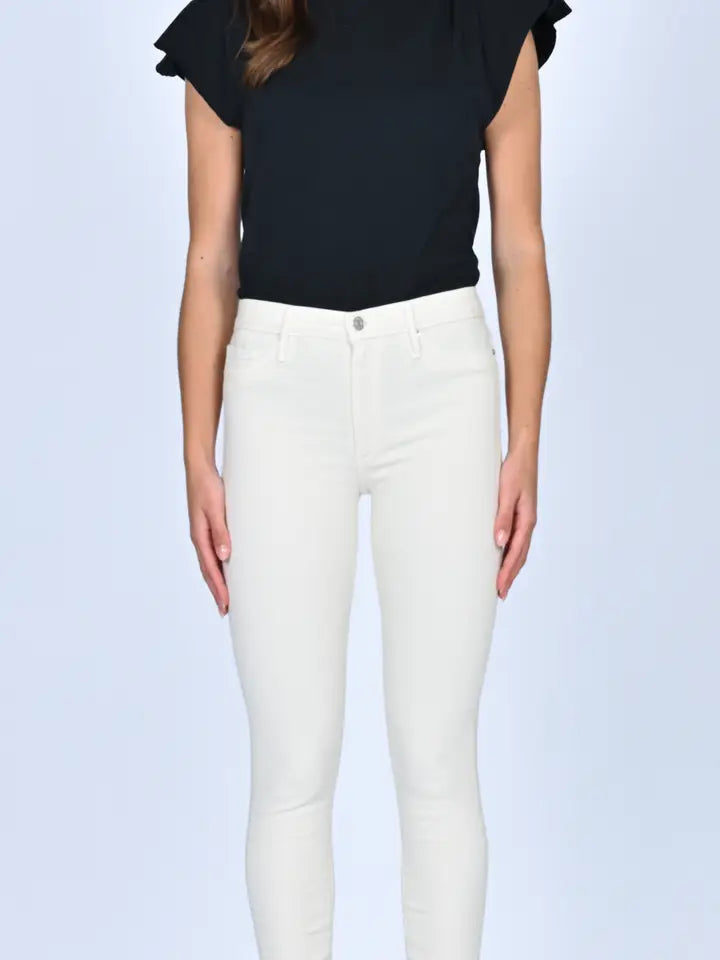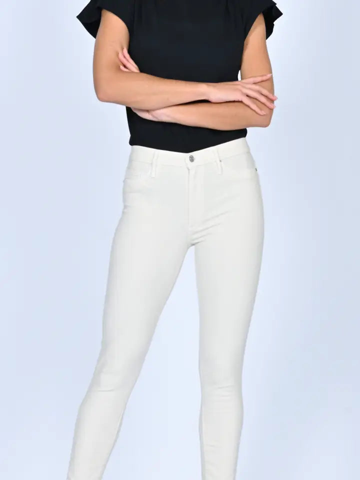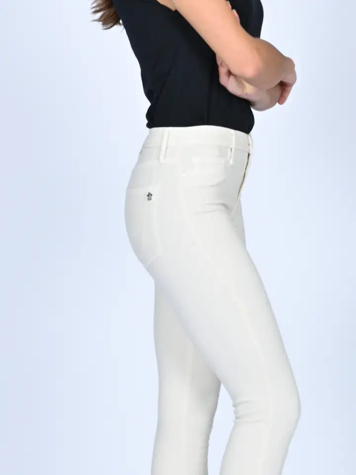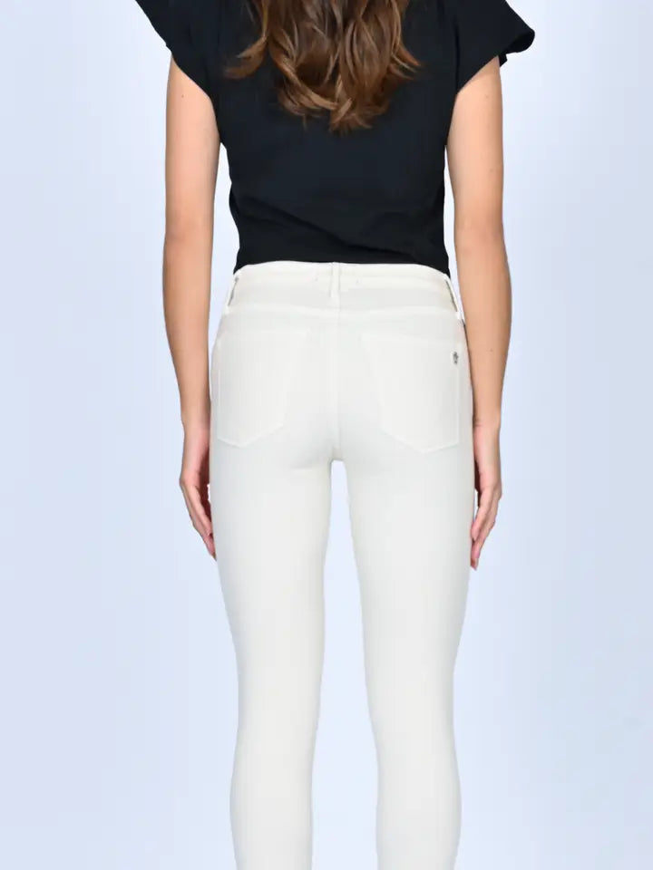 Elevate your denim collection with our Carmen High Rise Ankle Fray in Sweet Cream, an elegant ivory white shade. These signature skinny jeans offer a sophisticated slim fit with a flattering 10" high-rise and stylish frayed hems. Crafted from a premium 88% Cotton, 9% Polyester, 3% Spandex blend for exceptional comfort and shape retention. The 27.5" inseam and 10" leg opening create a versatile silhouette perfect for year-round styling. For optimal care, wash inside out with cold water and hang dry. Expertly made in Mexico.