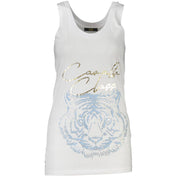 Indulge in the epitome of summer sophistication with this Cavalli Class tank top. Designed for the fashion-forward individual, it features wide shoulders and a classic round neckline that exudes effortless charm. The pristine white canvas is emblazoned with the brand’s signature print, making it a statement piece that boldly celebrates your love for luxury. Crafted from 100% cotton for superior comfort and breathability, this top will be your go-to for those chic, sun-drenched days.