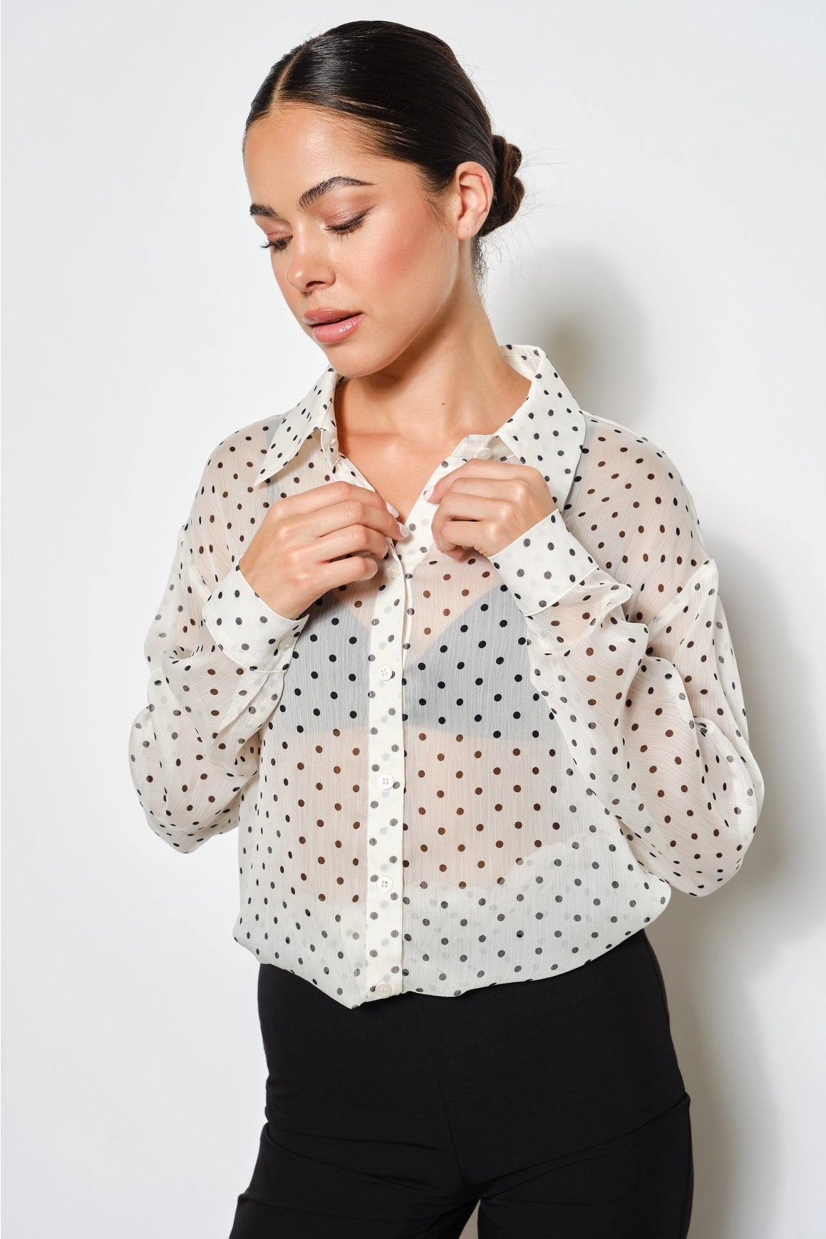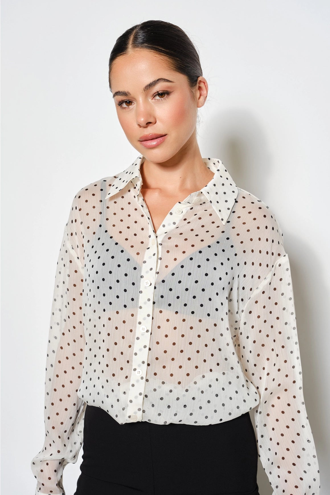 Playful yet classic, the Cecilia Polka Dot Shirt is your go-to for effortless charm! Featuring a lively polkadot print with a sharp collar, this long sleeve blouse is finished with a crisp front button closure for a timeless look. Made from lightweight, unlined polyester, it’s perfect for all-day comfort and easy everyday style. Model is 5’8” and wearing a size small. Fabric: 100% Polyester Keywords: polkadot print shirt, collared blouse, button front top, long sleeve shirt, lightweight women’s blouse, casual polyester shirt, classic polka dot top, unlined blouse, trendy women’s fashion, statement print shirt