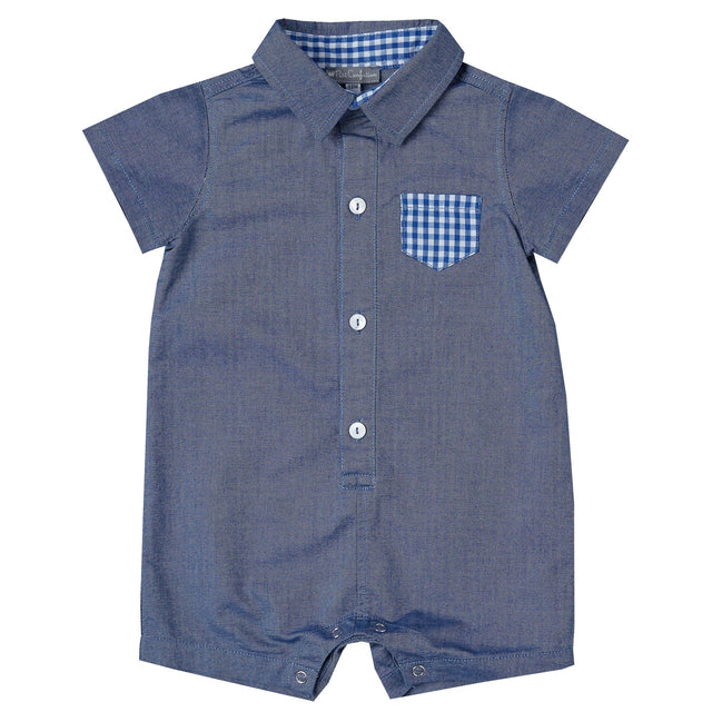 Petit Confection Style PS302 Your baby boy will look dapper from head to toe in this sweet romper! Lots of buttons for ease and comfort, soft chambray, and thoughtful details. Great for playdates and family vacations!