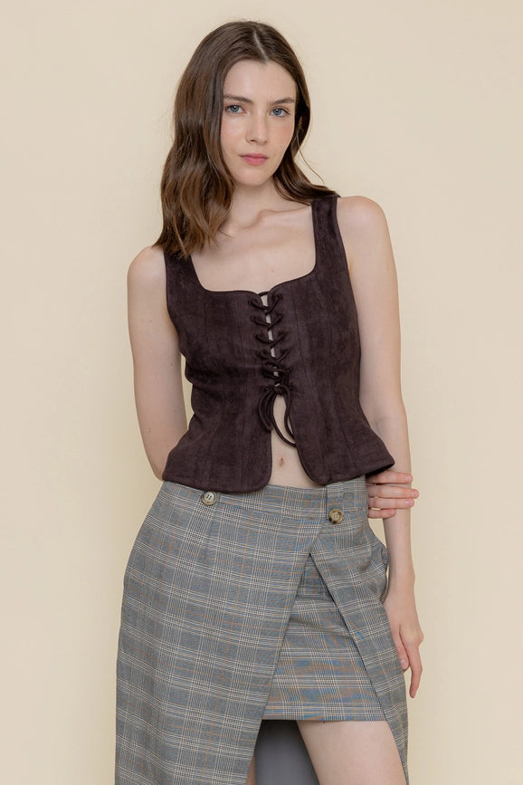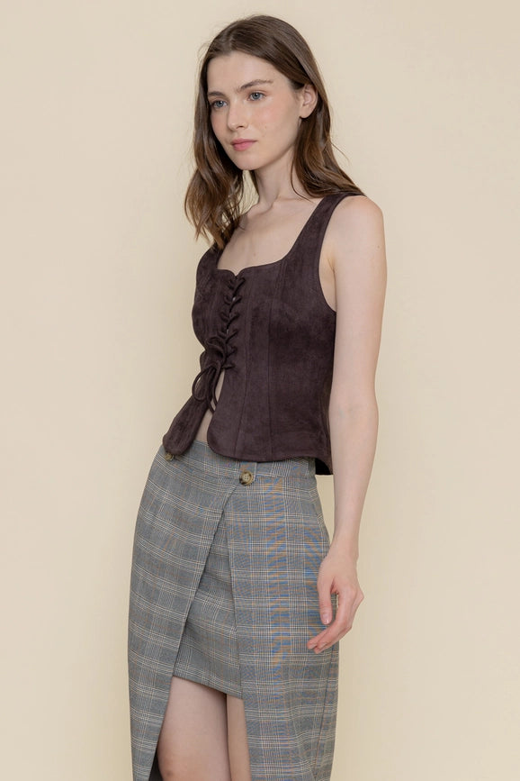 Chic Faux Suede Princess Line Front Tie Fit TOP DARK BROWN-Top-Fore Collection-S-DARK BROWN-Urbanheer