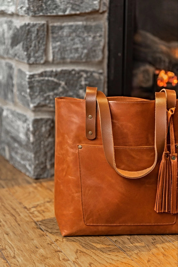 Expertly handcrafted with vegetable-tanned full-grain leather, the Classic Leather Tote is the perfect combination of spaciousness, durability, and style. With an interior zippered pocket, outer slip pocket, and charming leather tassel, this tote is both practical and elegant. Available in Coffee / Hazelnut and Saddle Brown, it's the ideal daily essential for the busy and fashion-forward individual.