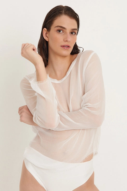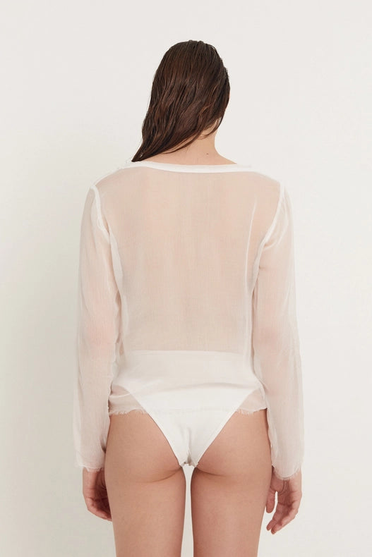 The Cleo Top in White is a must-have for any wardrobe. Its lightweight, sheer fabric elevates any look, especially when paired with a beautiful bralette. Handcrafted and made with care, this top exudes femininity and elegance. Whether worn by itself or layered, it's the perfect addition to any closet. Available in size XS and recommended for dry cleaning or gentle hand washing.