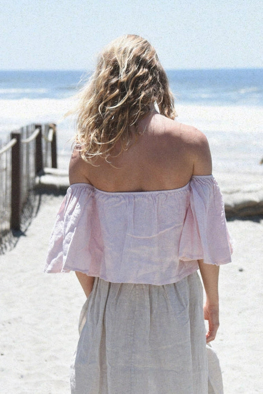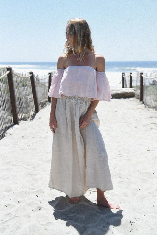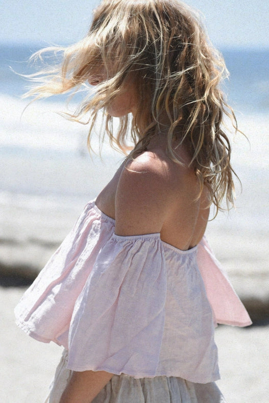 Introducing our Coco Top in Blush - your new go-to piece for effortless style. Made from super-soft linen, this off-shoulder top features a loose fit with a hidden ruched elastic bandeau for comfort and support. Plus, with every purchase, we will plant a tree in the Amazon Rainforest. Care instructions: Machine wash cold, hang dry for best results. Made in Italy.