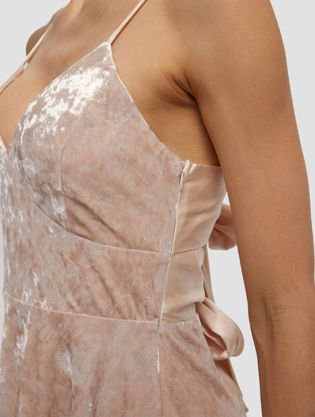 A charming dress with dainty spaghetti straps, a flirty tie back detail and mini length. The comfortable stretchy fabric allows for the slender body hugging torso and graceful flared bottom. This soft look is perfect for date night.