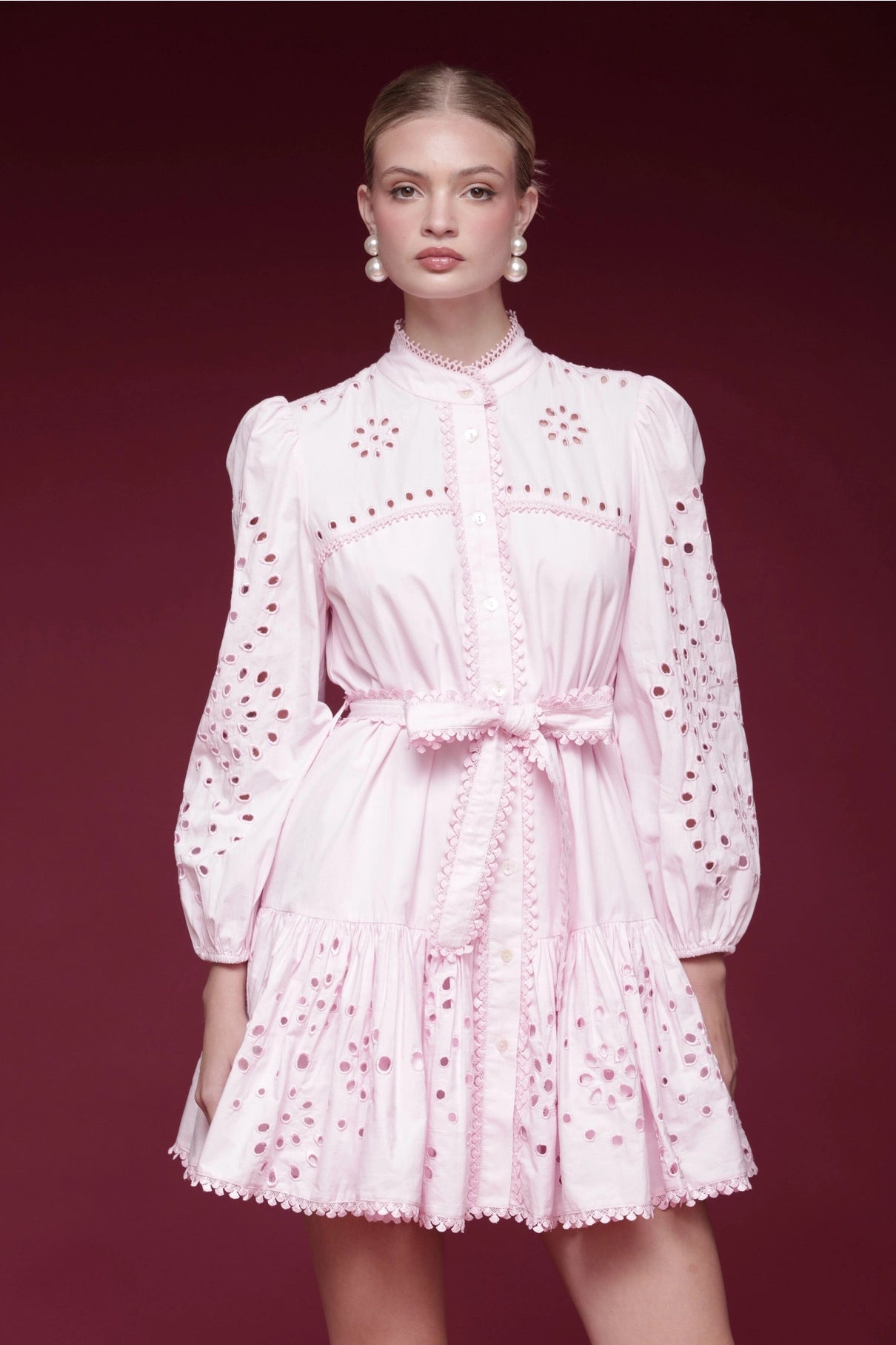This cotton shirtdress combines timeless elegance with practical design. Crafted in soft ballet pink, it showcases intricate broderie anglaise detailing that adds refined texture and visual interest. Puffed sleeves, lace-trimmed edges, and elasticated cuffs create a polished silhouette, while the included removable belt allows you to adjust the fit and styling to suit any occasion—from professional settings to weekend gatherings.