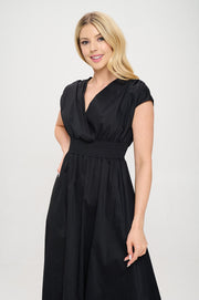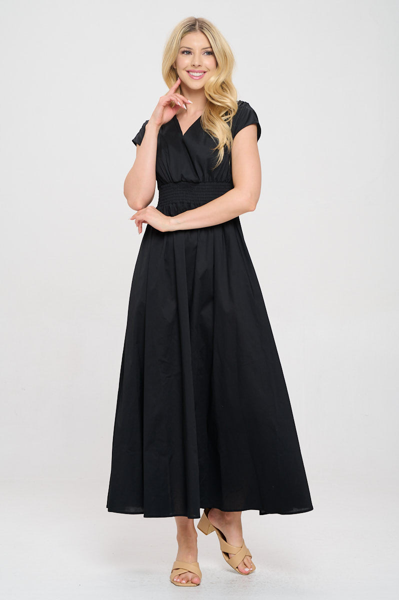 Made in USA Cotton Solid V neck Maxi Dress with Smock Waist. Fabric content: 97% Cotton, 3% Spandex.