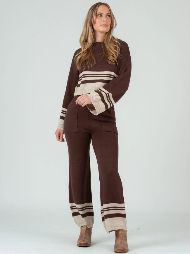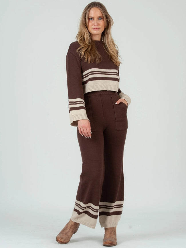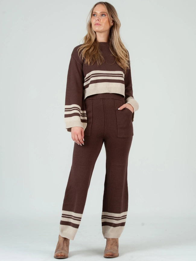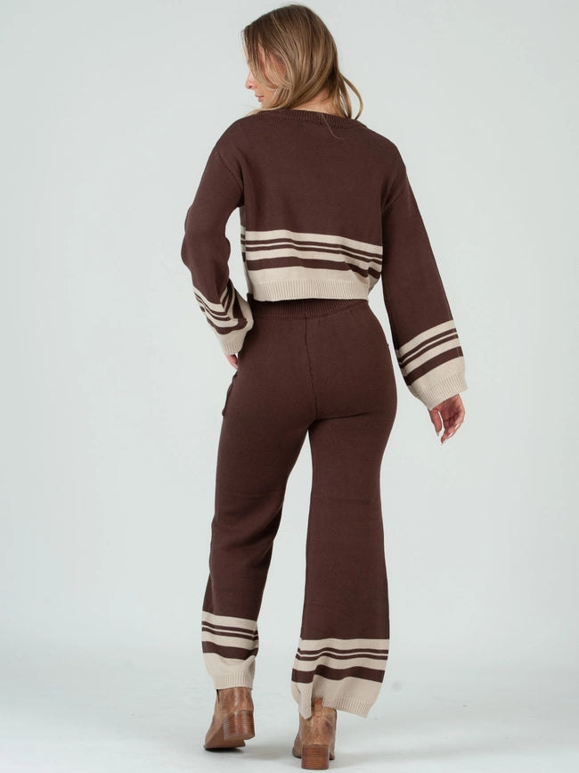 Crew Neck Striped Sweater Top and Pant Set in Brown Beige