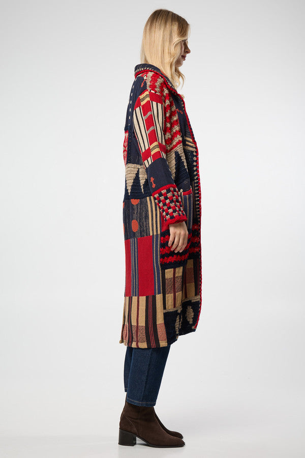 Embrace bohemian elegance with this exquisite Crochet Woven Aztec Kimono, where traditional craftsmanship meets contemporary design. Hand-crocheted details showcase authentic Aztec patterns in rich, harmonious hues that complement any complexion. The luxurious cotton-wool blend drapes gracefully across all body types, while the refined notched collar elevates the classic silhouette with modern sophistication. Versatile enough for casual seaside moments or layered over evening wear, this kimono transitions effortlessly from day to night. Dimensions: 46 x 22 inches with 21-inch sleeves. Composition: 92% Cotton, 8% Wool.