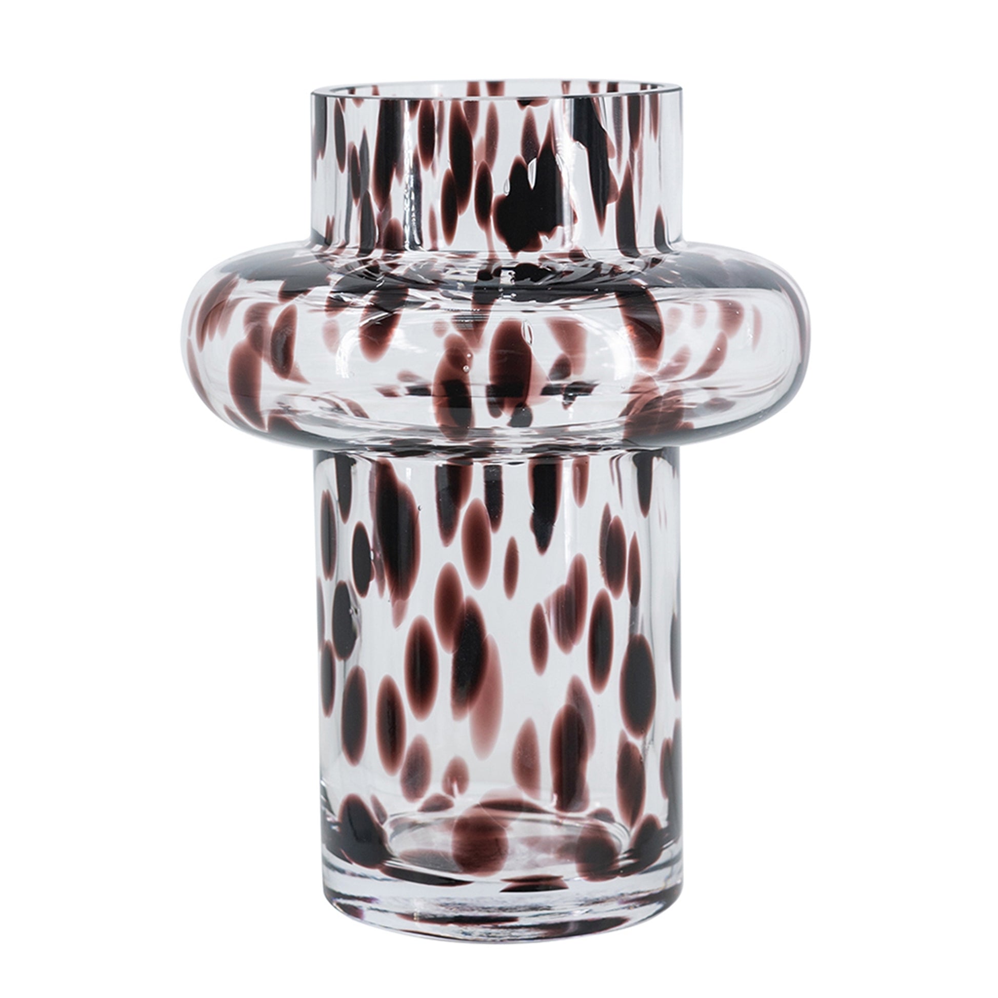 - Showcasing the beauty of modern abstract designs, this vase boasts a wide, cylindrical silhouette, an alluring disc accent, and a series of amber spots stretching out across the clear glass surface.