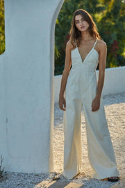 Denim Cotton Plunged V-Neck Wide Leg Jumpsuit Ivory