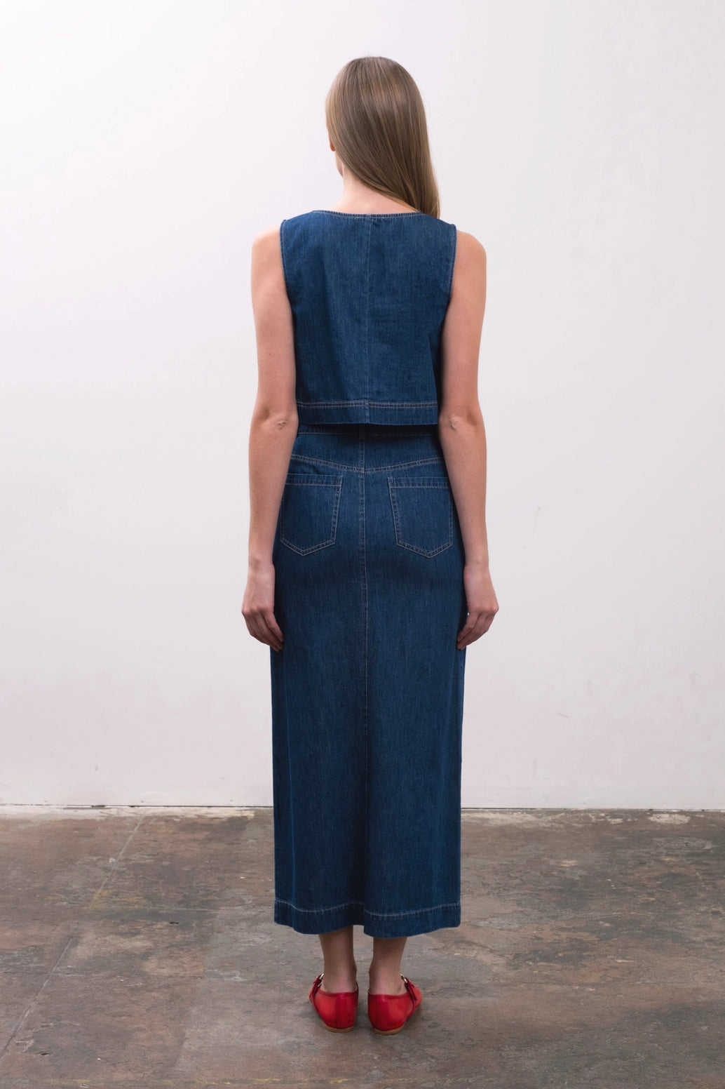 This woven denim top features a square neckline and a sleeveless, cropped design. Crafted from 100% cotton, it is unlined for a lightweight, breathable fit.