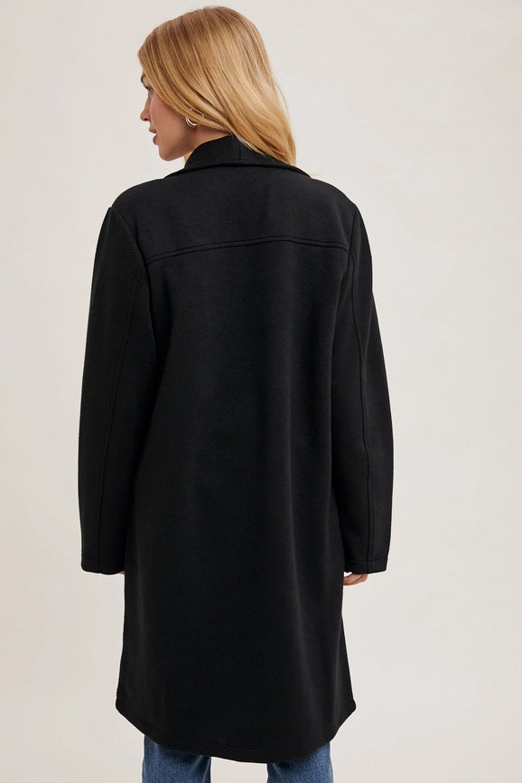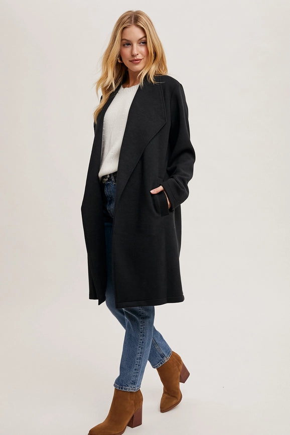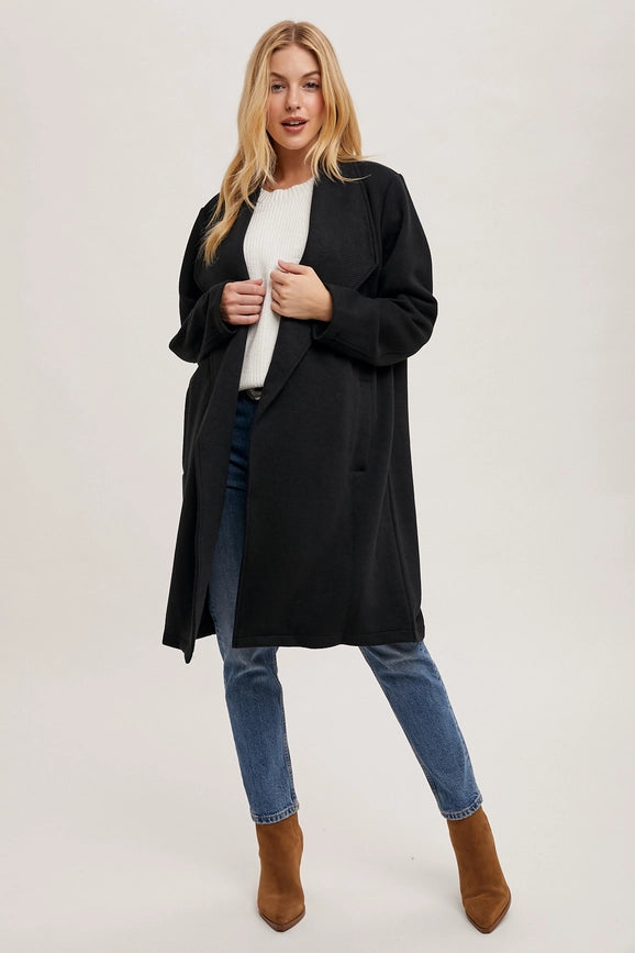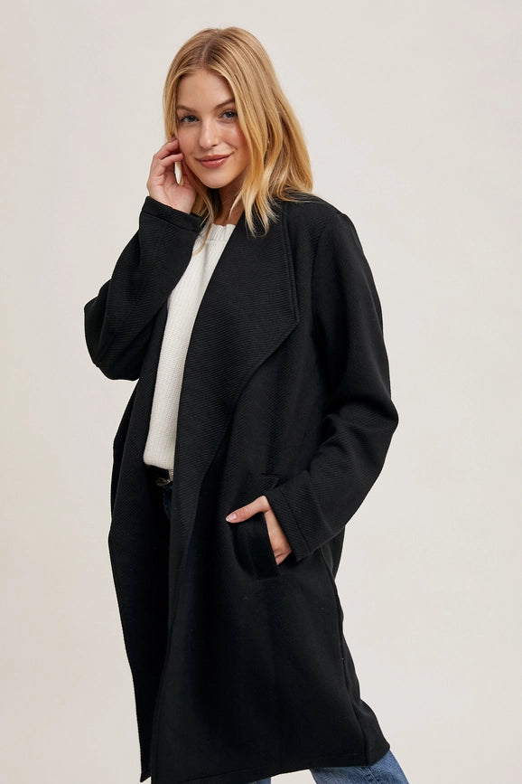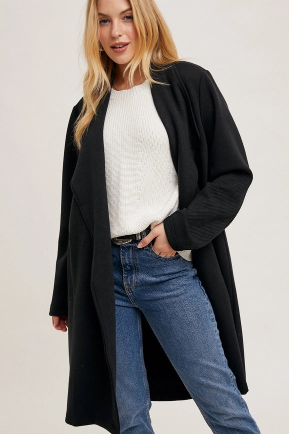 Introducing the versatile and chic Drape Open-Front Coat Jacket. With its textured knit and draping design, this jacket offers a sophisticated and effortless look for any occasion. Equipped with side pockets and an open front, it combines practicality with style to elevate your attire. Lend depth and visual interest to any outfit with this must-have jacket.