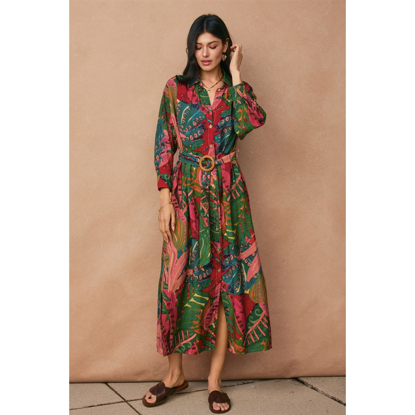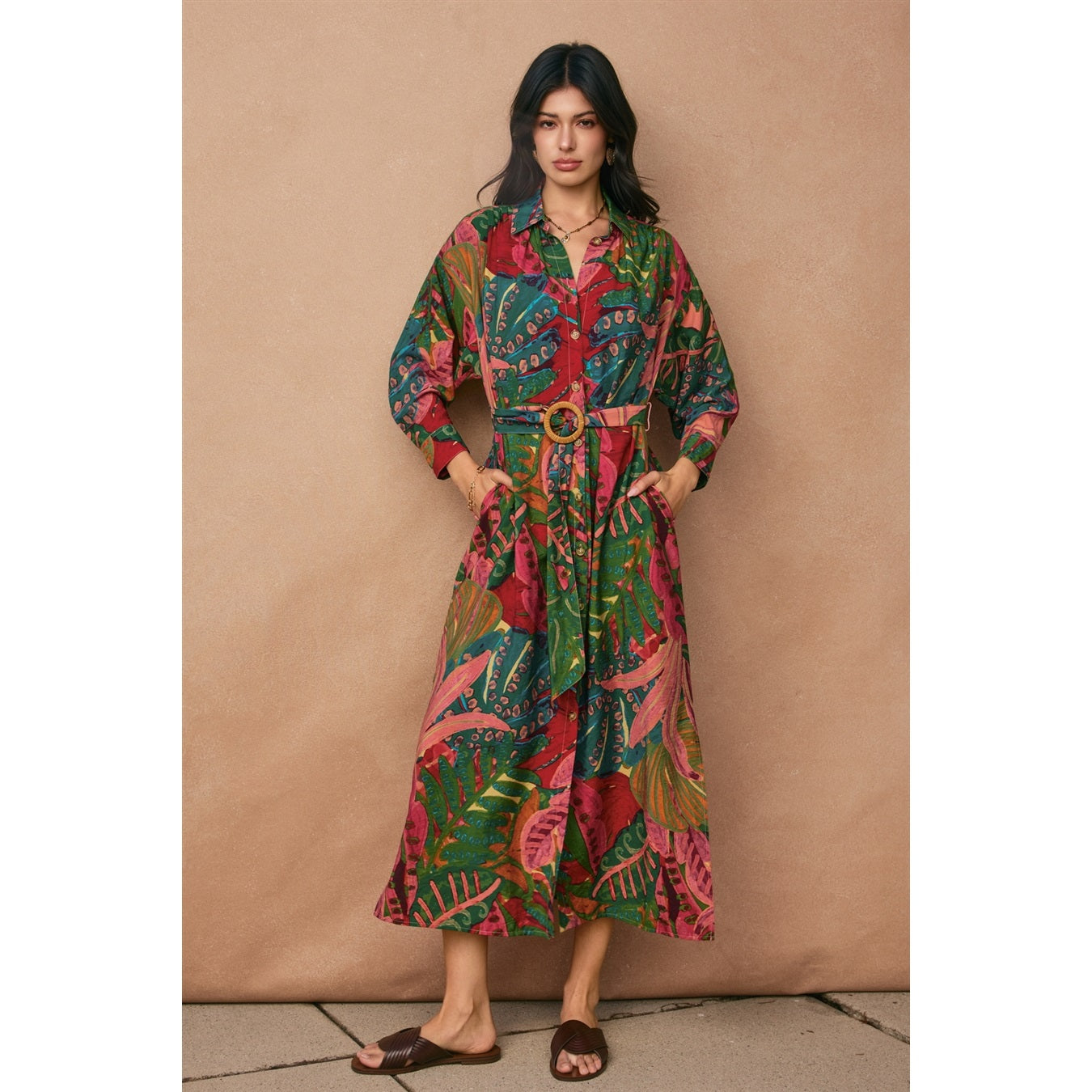 Embrace effortless elegance with this tropical print midi dress, designed for the modern woman who values both style and substance. Featuring a refined collar and half sleeves finished with buttoned cuffs, this piece offers understated sophistication. The front tortoise button closure and self-covered buckled belt create a polished silhouette, while practical side pockets add everyday functionality. Crafted from a breathable rayon and nylon blend, this unlined dress drapes beautifully and moves with you. Perfect for transitional seasons and versatile enough for multiple occasions.