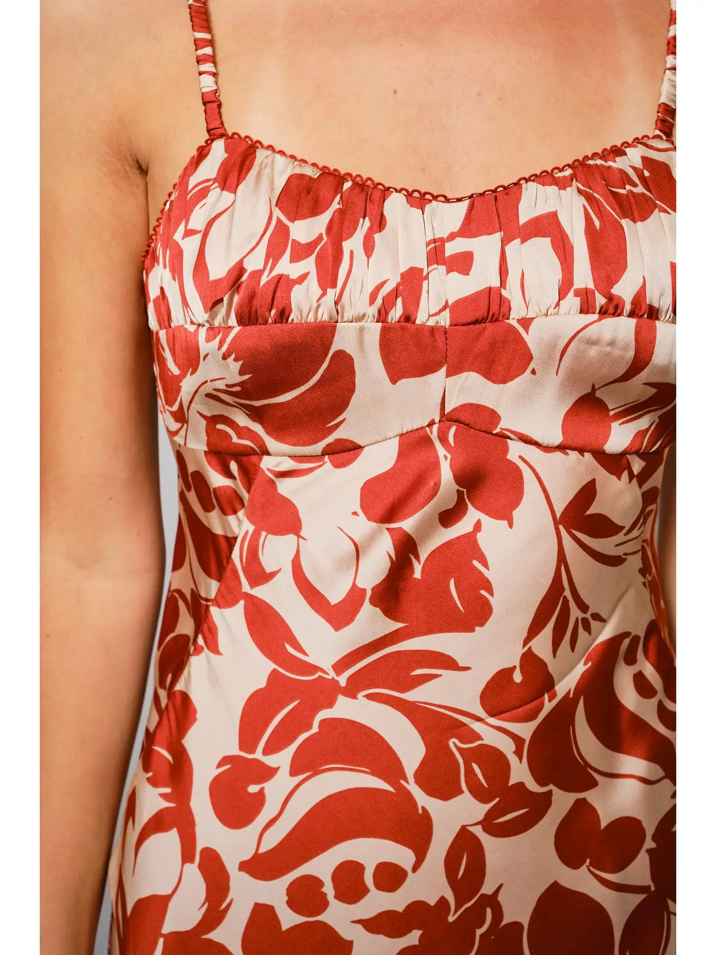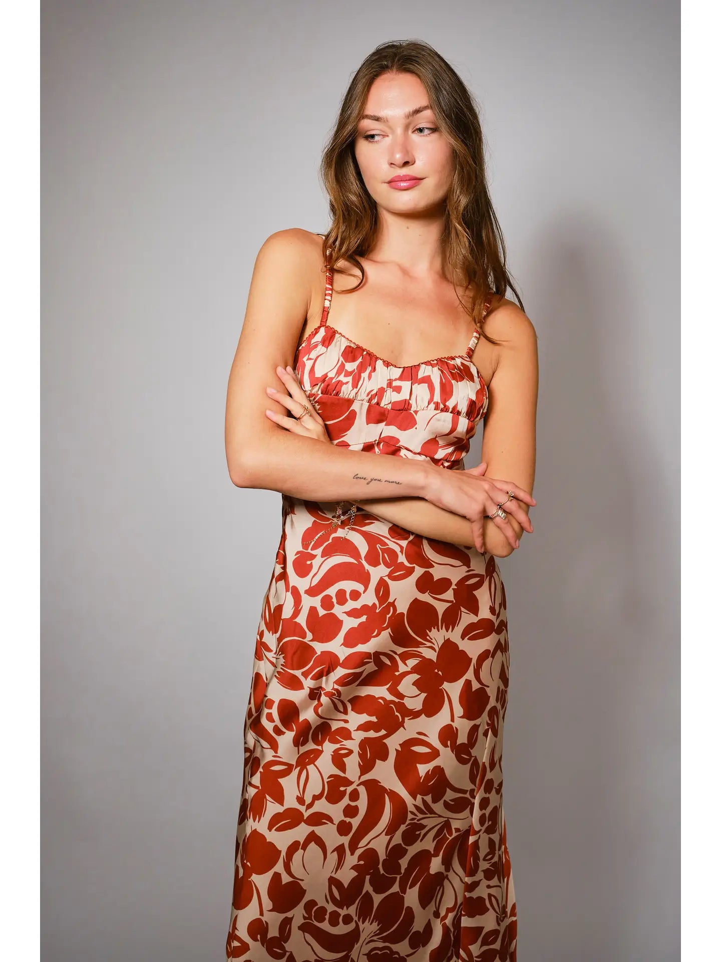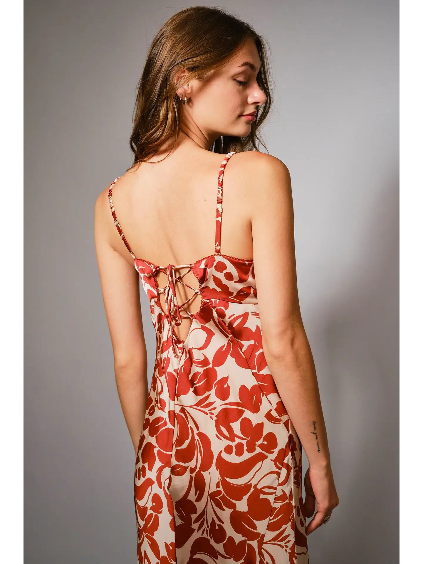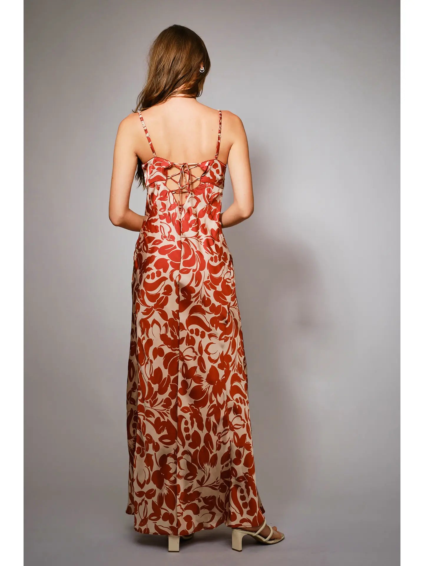 Crafted from lightweight polyester, this maxi dress showcases delicate spaghetti straps and an elegant gathered bust that flatters the silhouette. The romantic floral print spans the entire garment, while an adjustable lace-up back allows for a customized fit. Perfect for elevated casual occasions or garden-inspired events. Model pictured is 5'8" wearing size Small.