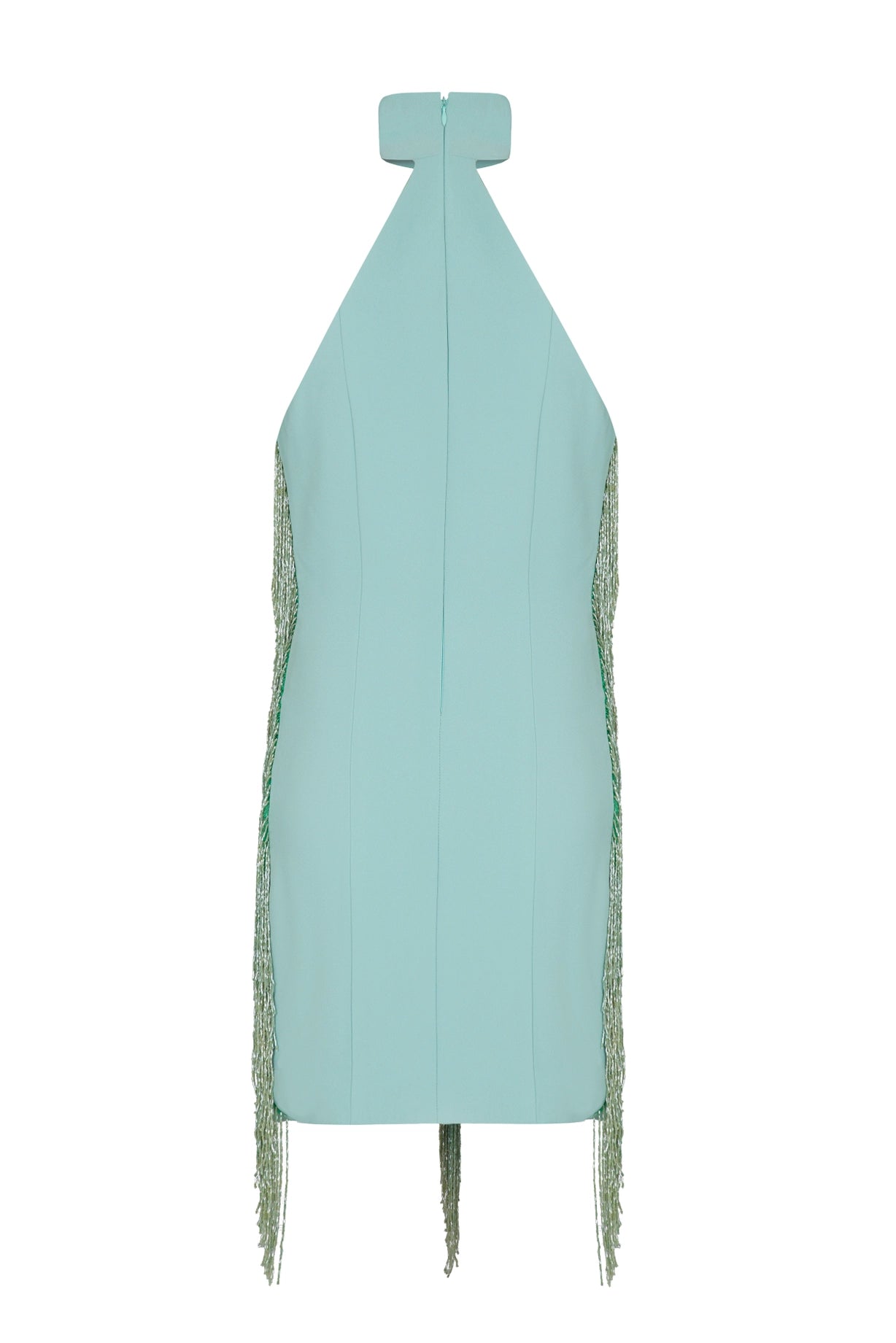 Crafted from luxurious mint crepe, the Eleni Dress commands attention with its elevated halter design and dramatic vertical fringe that flows gracefully throughout. The cascading fringe detail creates an elongated silhouette while delivering dynamic movement with every step, making this mini dress a refined choice for those seeking understated glamour with a contemporary edge.