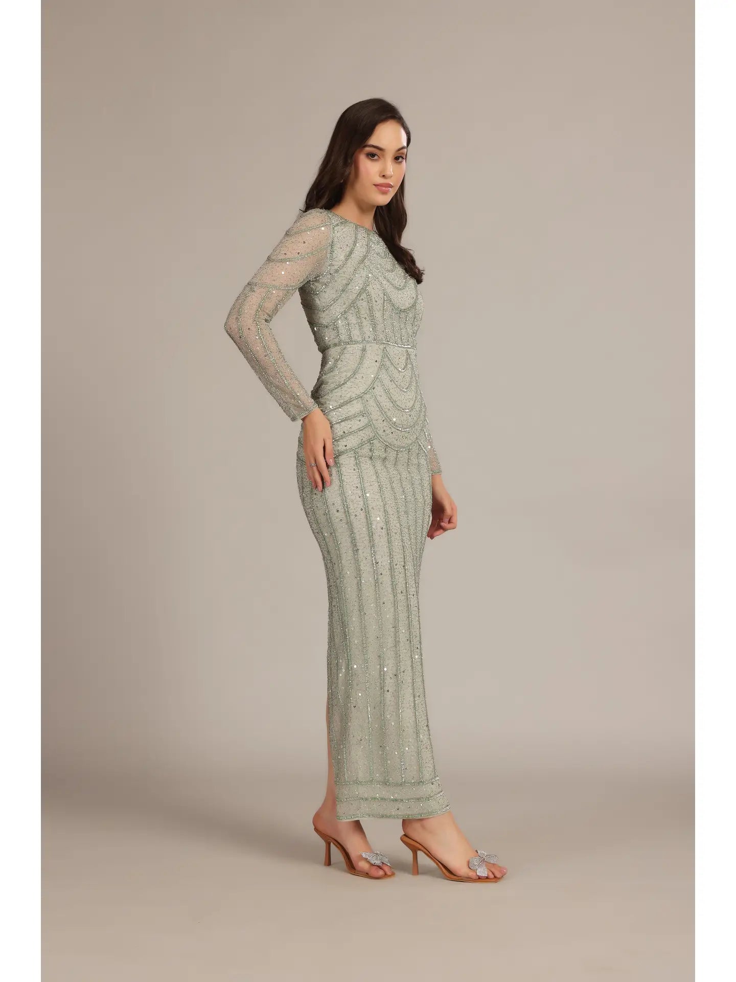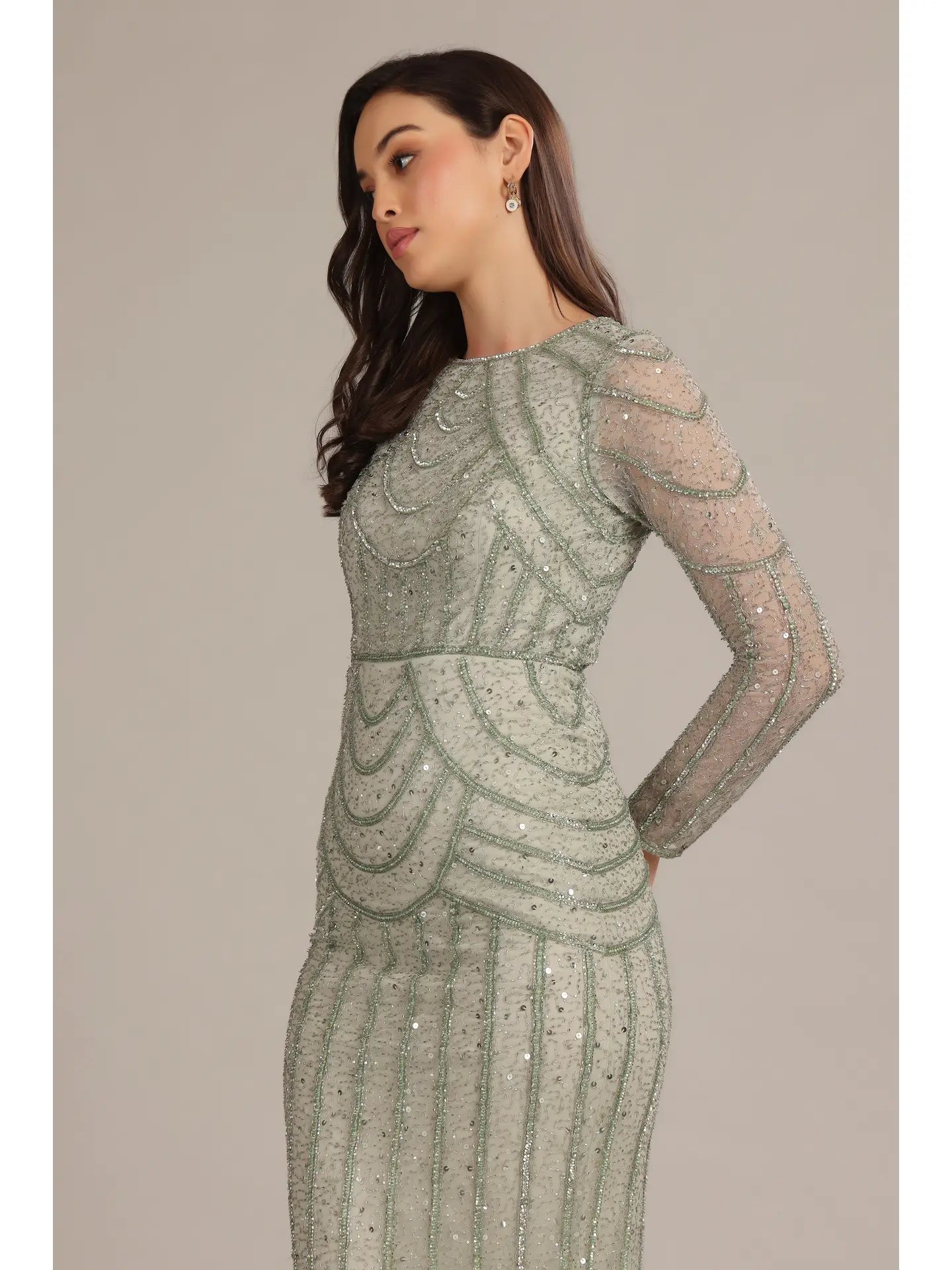 The Ellis Maxi Dress in Sage Green combines sophisticated design with exquisite craftsmanship. Featuring a hand-embellished sequin bodice, this dress offers subtle sparkle that enhances its refined high neckline and long sleeves. The flowing A-line skirt creates an elegant silhouette, making it an ideal choice for weddings, galas, and other formal events where timeless style is essential.