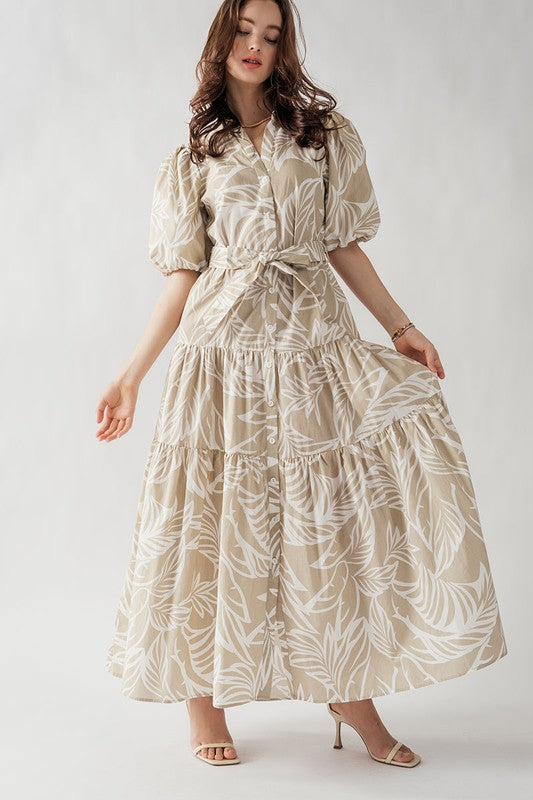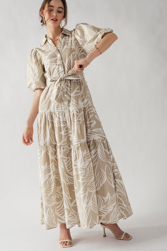 This Elsie Tropical Print Maxi Sundress features puffy sleeves, a collared button down design, and a belted tie for a flattering fit. Made from 100% cotton, this dress is lightweight and comfortable, perfect for any day out. The leaf plant print adds a touch of tropical beauty to any wardrobe.