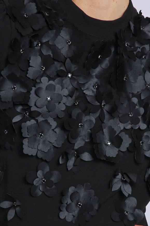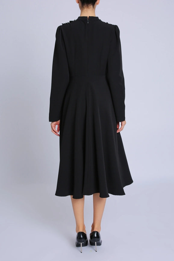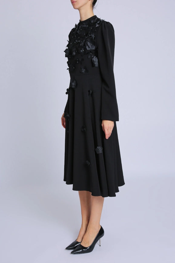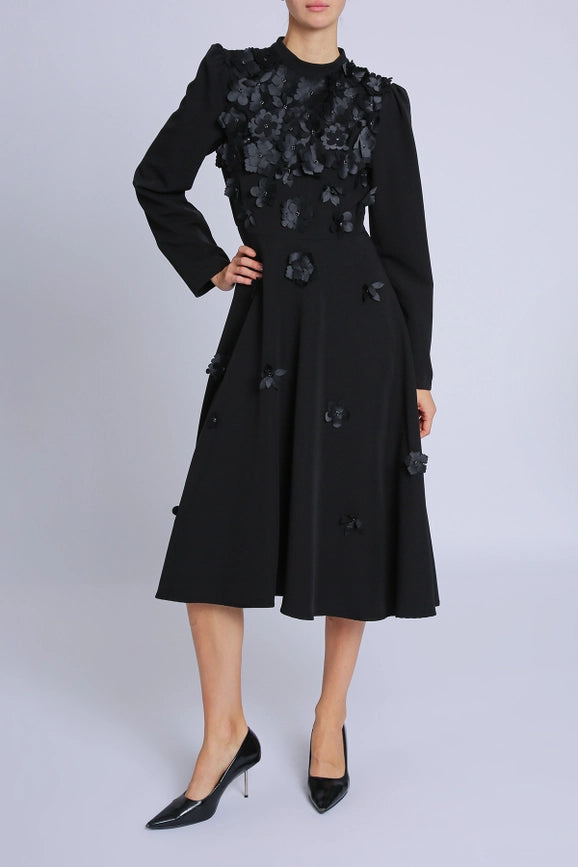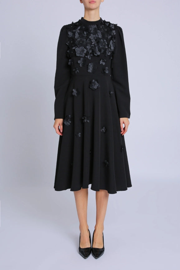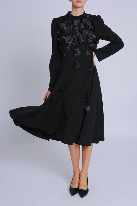 This elegant A-line midi dress features intricate embellished floral appliques on a solid fabric, accented with micro rhinestones for a touch of sparkle. The mock neck, puff shoulders, and long sleeves add sophisticated details, while the back zipper closure allows for easy on and off. Available in Black and Beige, this dress is perfect for any occasion. Make a statement while caring for the environment with lower temperature and delicate spin cycles for washing. Imported and available in regular fit. Model size 5' 10" Wearing S size.