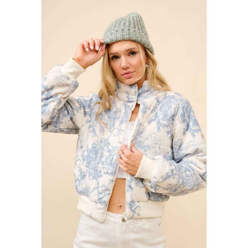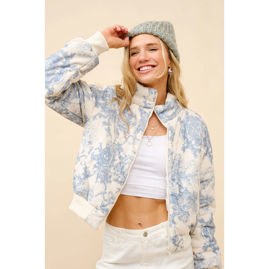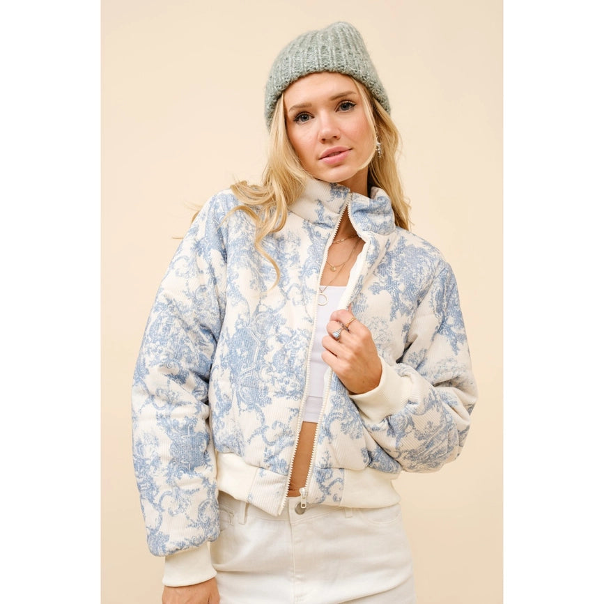 Perfect for cooler days, Embrace Cozy Chic with the Toile Inspired Corduroy Puffer Crop Jacket. Featuring a traditional toile-inspired design paired with soft corduroy, this lightweight puffer jacket offers both warmth and elegance. Whether dressed down or up, elevate your style while staying comfortable and cozy.