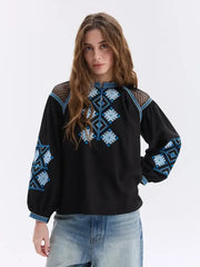 This women's embroidered blouse combines 55% cotton and 45% linen for a breathable, soft feel ideal for spring and summer. Handmade in Ukraine, it features intricate black embroidery inspired by traditional folk art, blending floral and geometric motifs. Crafted with natural fibers, this artisanal blouse offers both cultural heritage and eco-friendly slow fashion appeal. Machine washable for easy care, it’s a timeless piece that elevates boho and ethnic wardrobes with authentic craftsmanship and elegant ornament detailing.