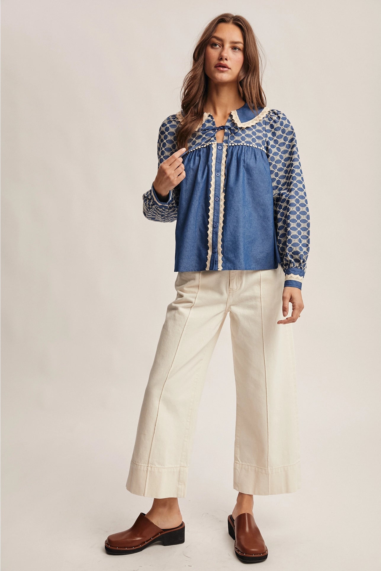 Crafted from supple cotton denim, this blouse seamlessly blends Western heritage with romantic sensibility. Intricate embroidered motifs grace the sleeves and yoke, while delicate ivory lace adorns the Peter Pan collar, button placket, and cuffs for understated femininity. The gathered bodice creates an elegant, relaxed drape, while softly puffed sleeves tapered at the wrists add refined dimension. A self-tie neckline and functional front buttons ensure versatile styling options. Whether paired with denim, shorts, or a skirt, this piece delivers effortless sophistication and timeless appeal.