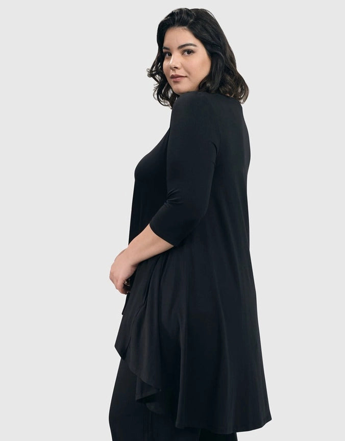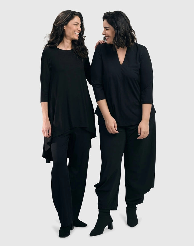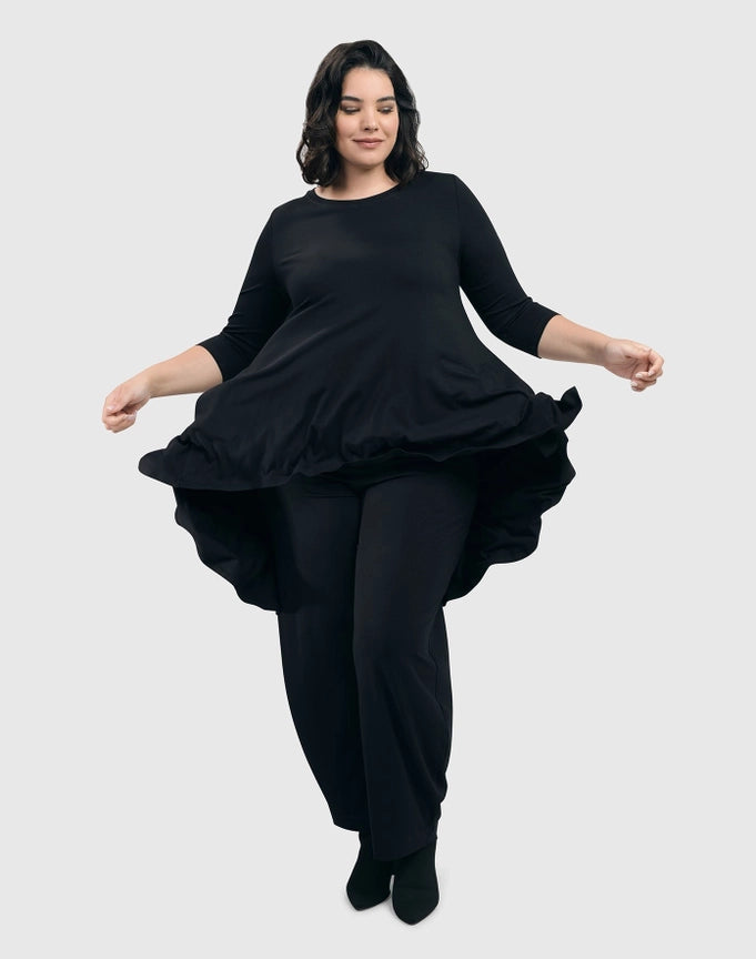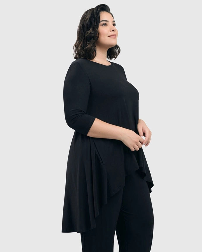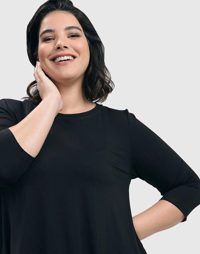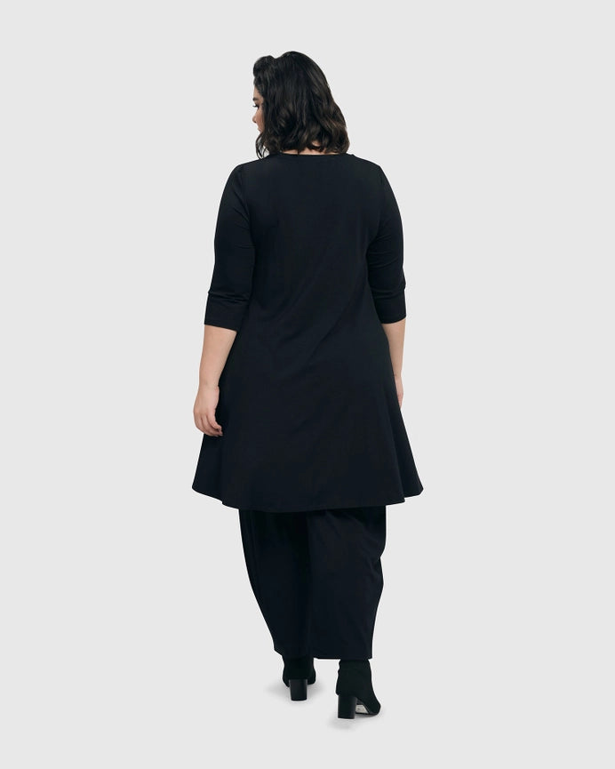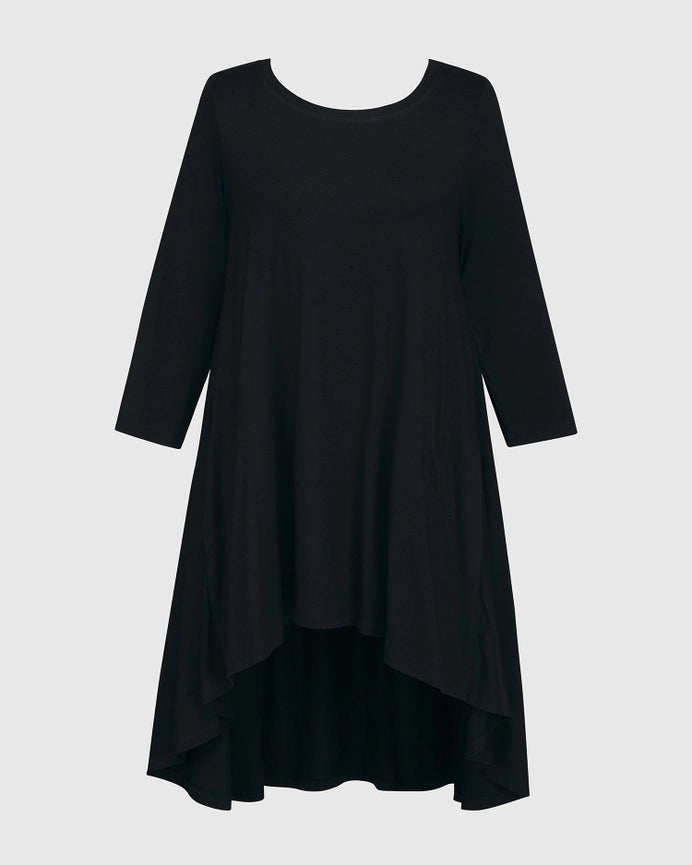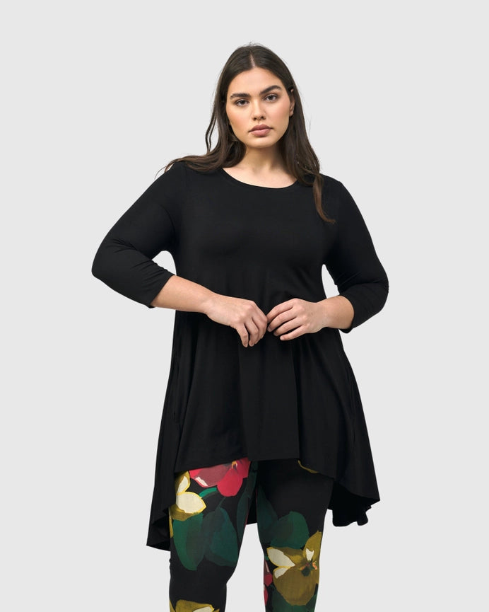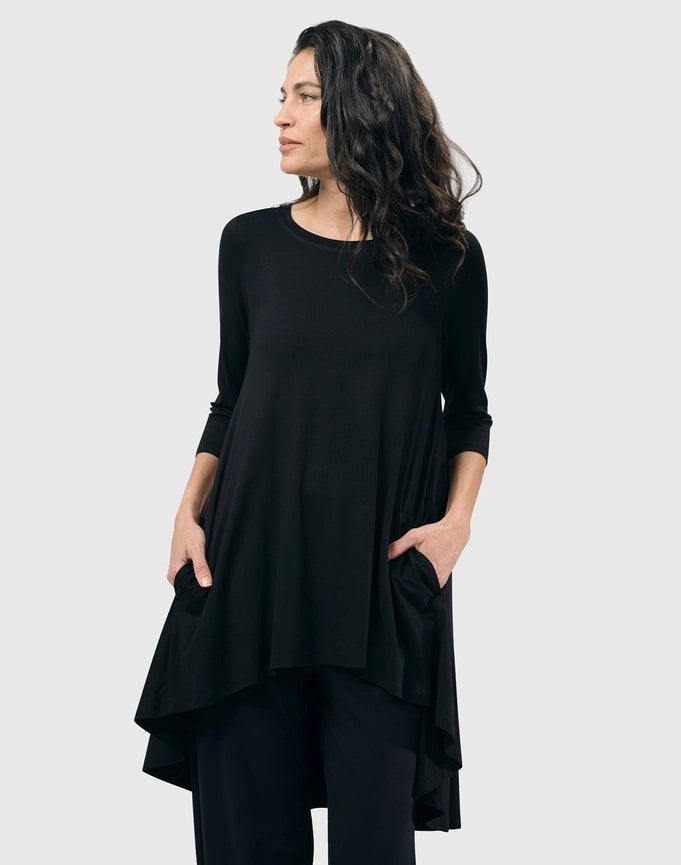 Experience effortless style with our Essential Swing Tunic Top in black. The jersey knit fabric provides comfort and freedom of movement with its swingy shape and hi-lo hem. Flattering details like the bias-cut pullover, round neck, and hidden side pockets make this top a must-have for any wardrobe.