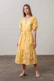 This midi dress features a split neckline and short puff sleeves for a stylish look. It also has an elastic waist band and waist tie detail to create a flattering silhouette. The eyelet detail adds a touch of elegance, while the 100% cotton material ensures comfort. Perfect for any occasion, this dress is not lined and comes in a solid color.