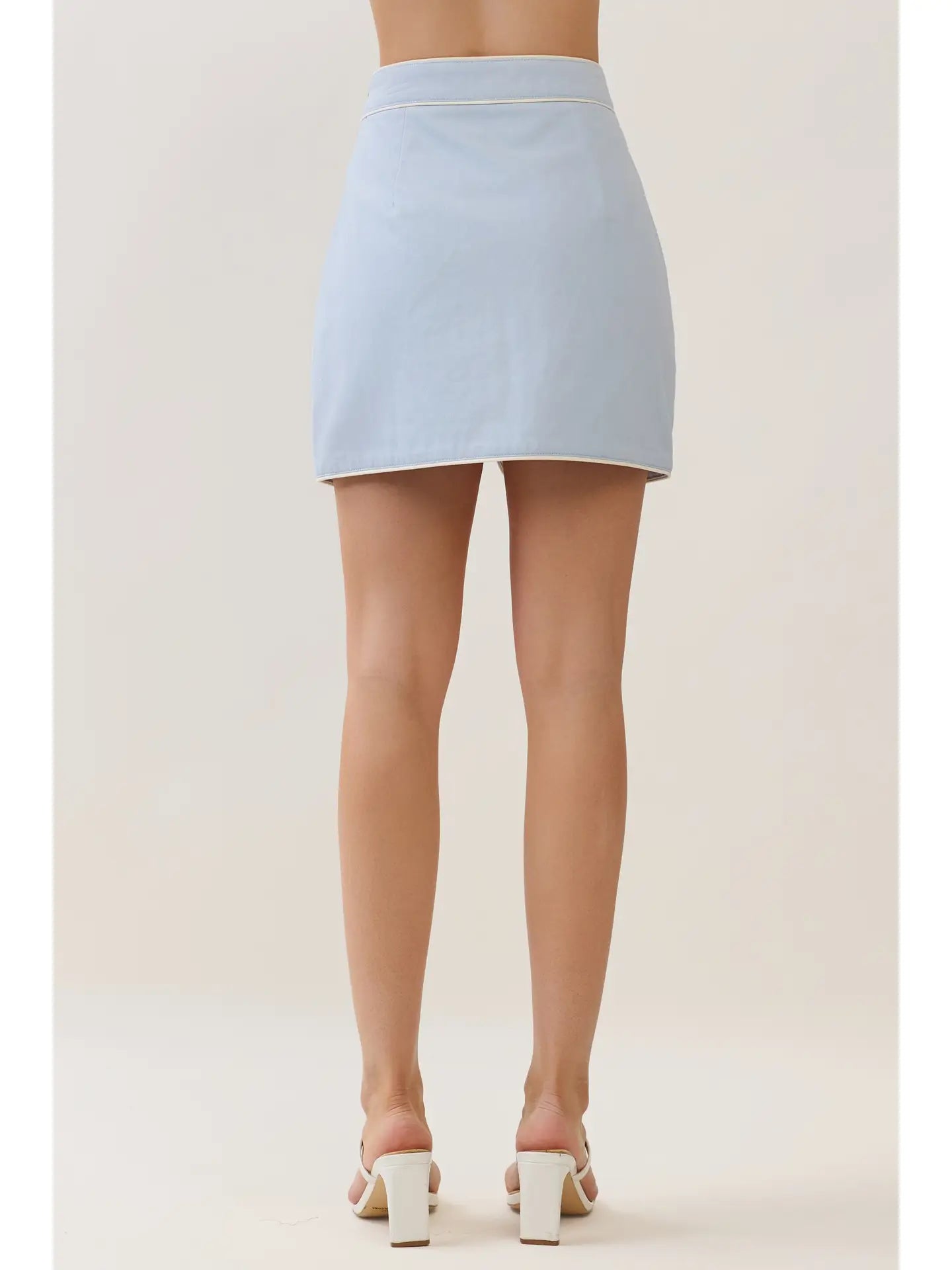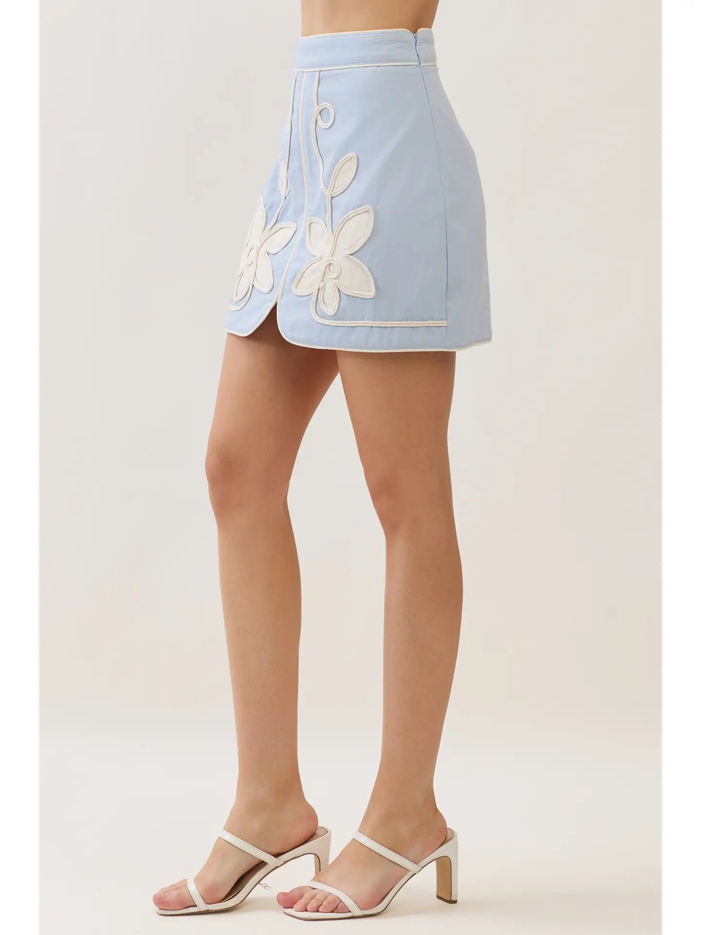 Elevate your wardrobe with this sophisticated mini skirt, where refined craftsmanship meets contemporary elegance. The high-waisted silhouette flatters the figure while intricate floral appliqué adorns the front panel, creating a striking focal point. A graceful front slit adds movement and allure, complemented by delicate piping trim that frames the design with precision. Secured with a discreet side zipper, this piece transitions seamlessly from day to evening, offering timeless style with a modern edge.