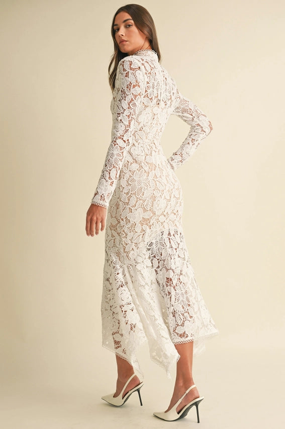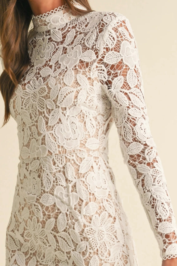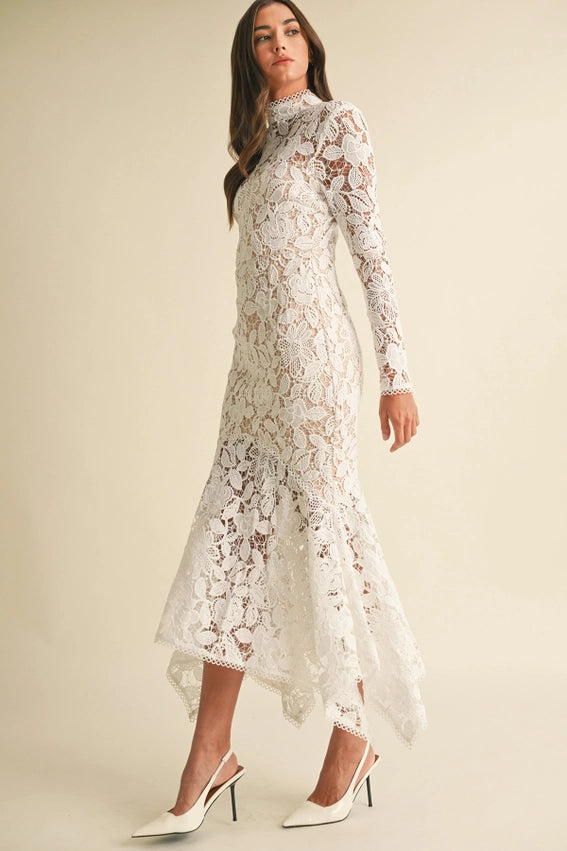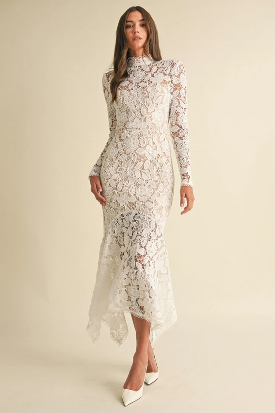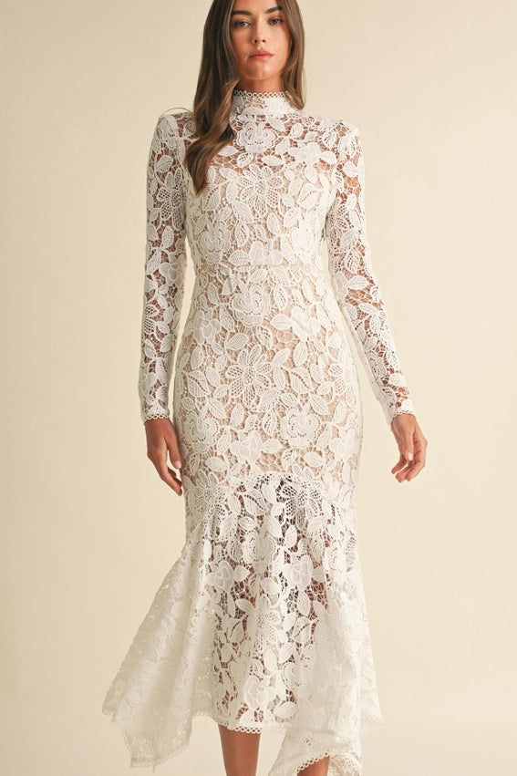 Look effortlessly romantic and feminine in our Floral Lace Midi Dress. Boasting an exquisite floral lace with lace trim, this dress features a body-hugging silhouette, mock neckline, long sleeves, and a ruffle fishtail hem. Perfect for any occasions, this dress is a must-have for the pre-fall season. Care instructions: hand wash. Fabric: self 100% polyester, lining 100% polyester.