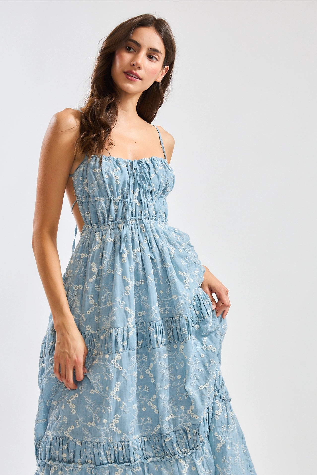 Floral Midi Dress with Tiered Skirt and Open Back