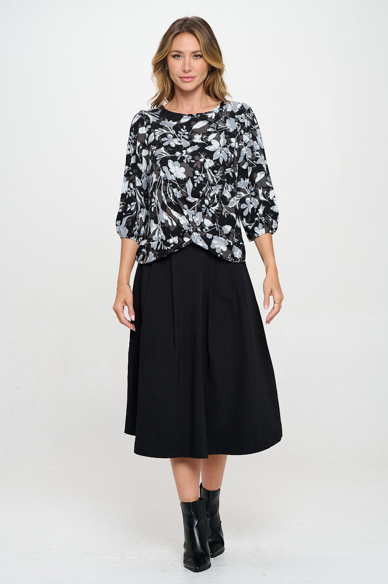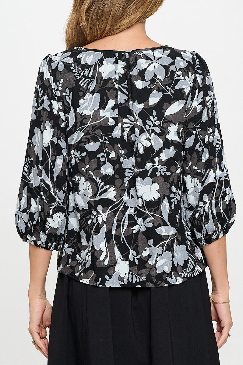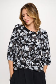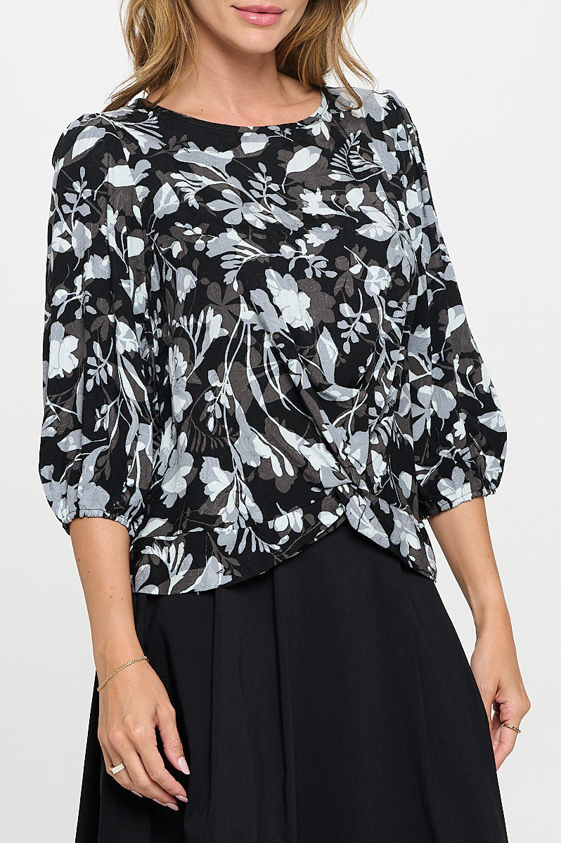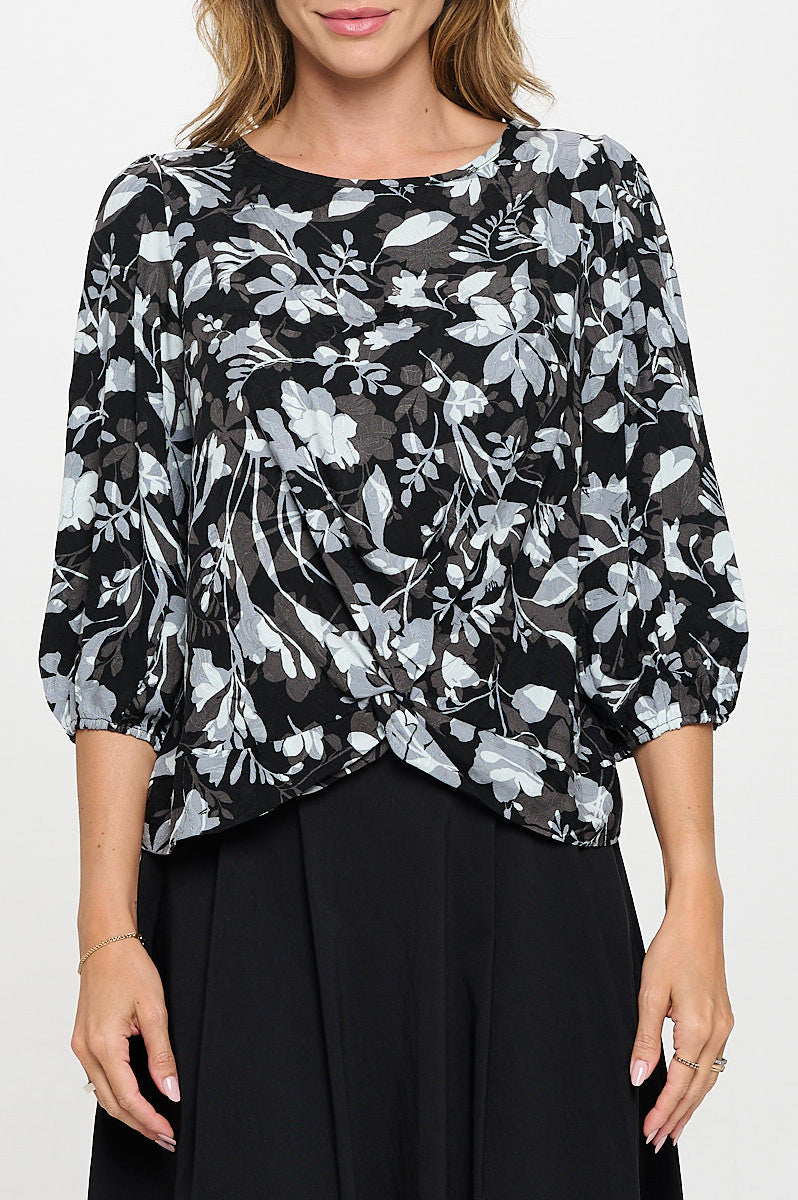 Made in USA Floral Print 3/4 Sleeve Top with Front Twist. Fabric content: 100% Rayon.