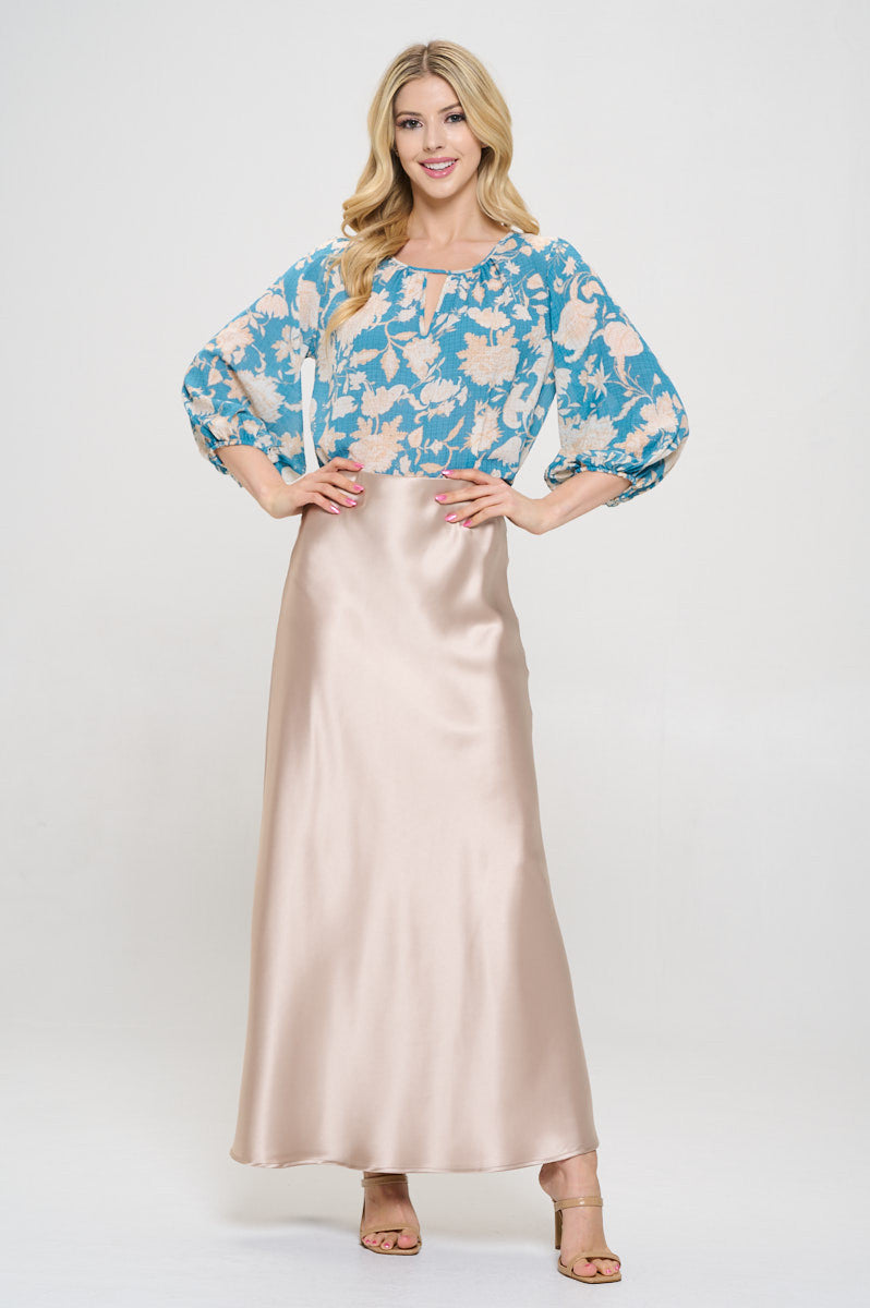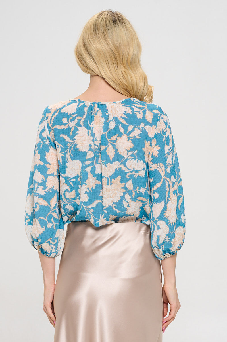 Floral Print 3/4 Sleeve Top with Notch Neck