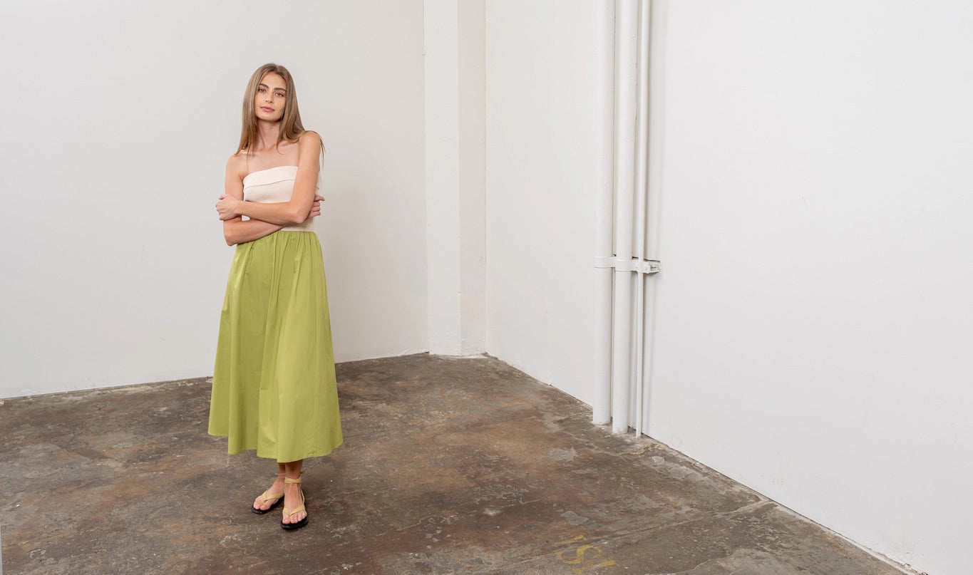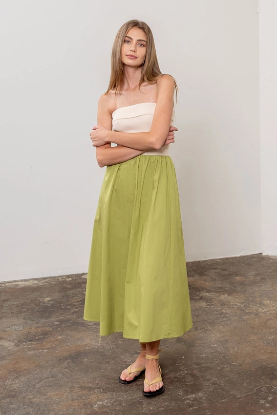 This midi dress combines the comfort of a strapless, sleeveless knit top with the sophistication of a foldover, A-line silhouette. The mixed media design features a 100% cotton shell and contrasting Viscose/Polyester blend, providing both style and ease. Perfect for any occasion.